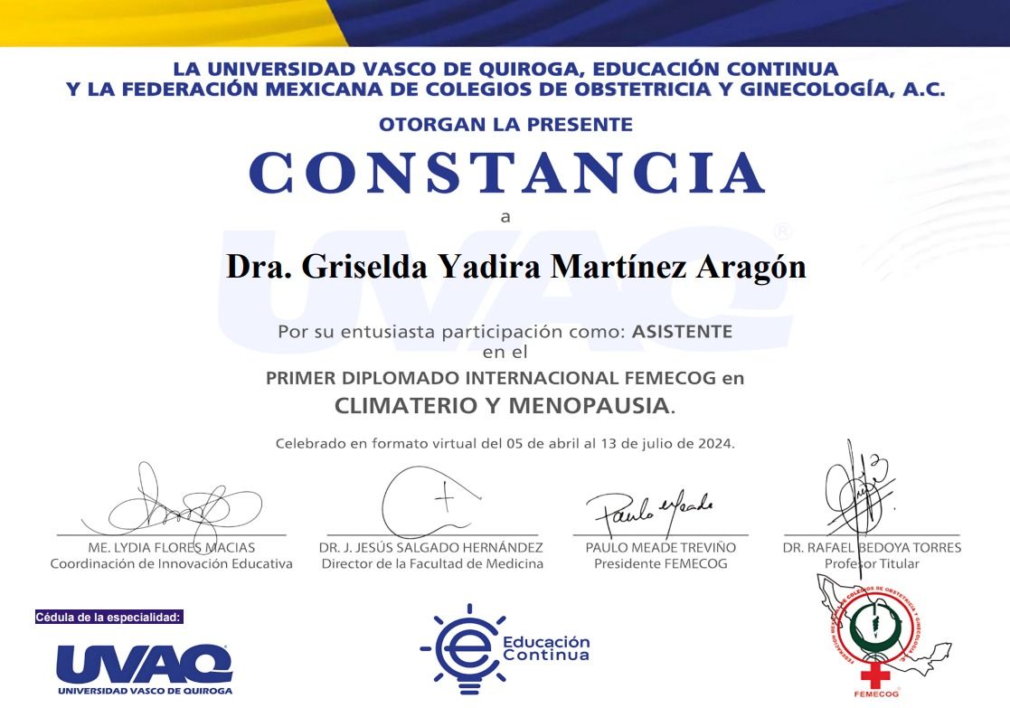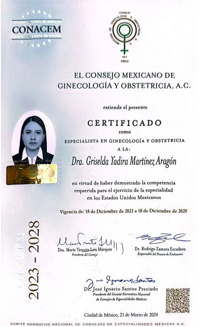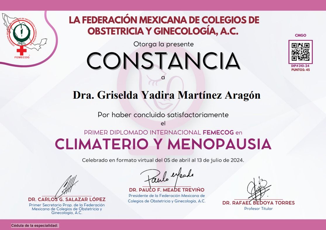 Soy la Dra. Griselda Martínez Aragón, ginecóloga y obstetra formada en el INPer, con alta especialidad en cirugía ginecológica de mínima invasión y diplomado en climaterio y menopausia.
