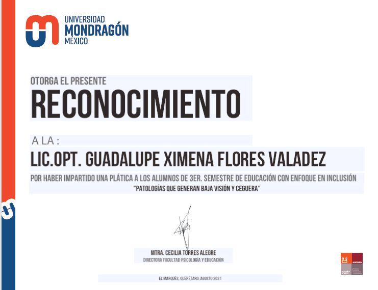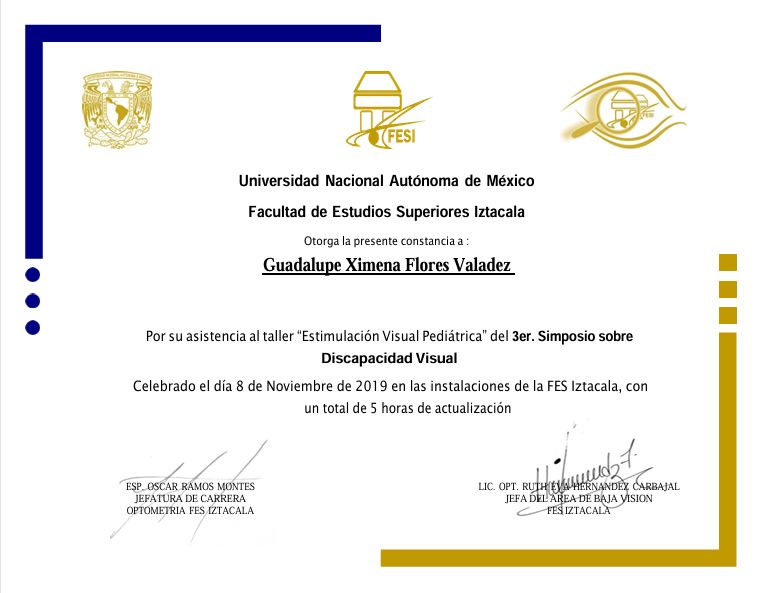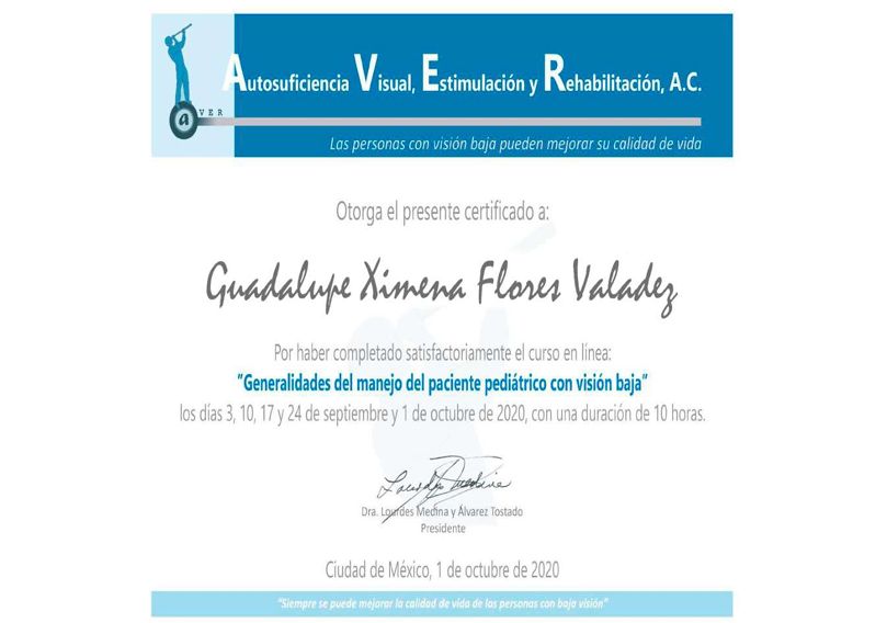 Especialista en Rehabilitación Visual Hola, soy Ximena Flores Valadez, Mtra. en Rehabilitación Visual con un enfoque integral en la atención a pacientes con discapacidad visual. Soy egresada del Instituto Politécnico Nacional de México, donde obtuve mi Licenciatura en Optometría, y más tarde, profundicé mis estudios realizando una Maestría en Rehabilitación Visual en la Universidad de Valladolid en España.