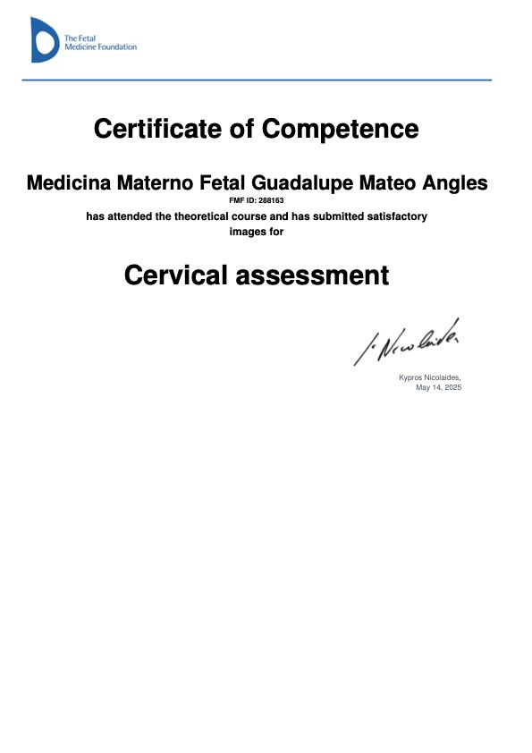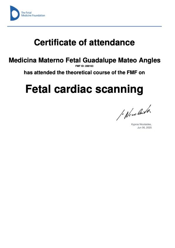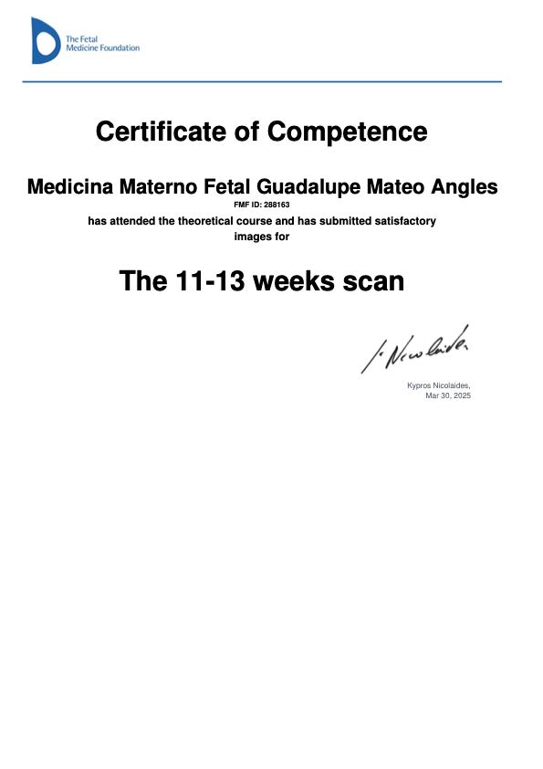 Cuento con doble certificación por el Colegio Mexicano de Ginecología y Obstetricia y adicional a esto, cuento con la certificación de la Fetal Medicine Foundation.