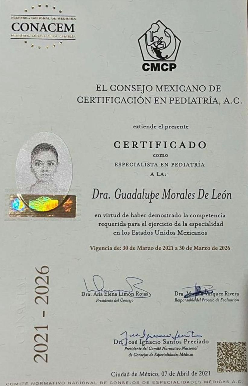 Certificación del Consejo Nacional de Pediatría: N° Certificado: 15764