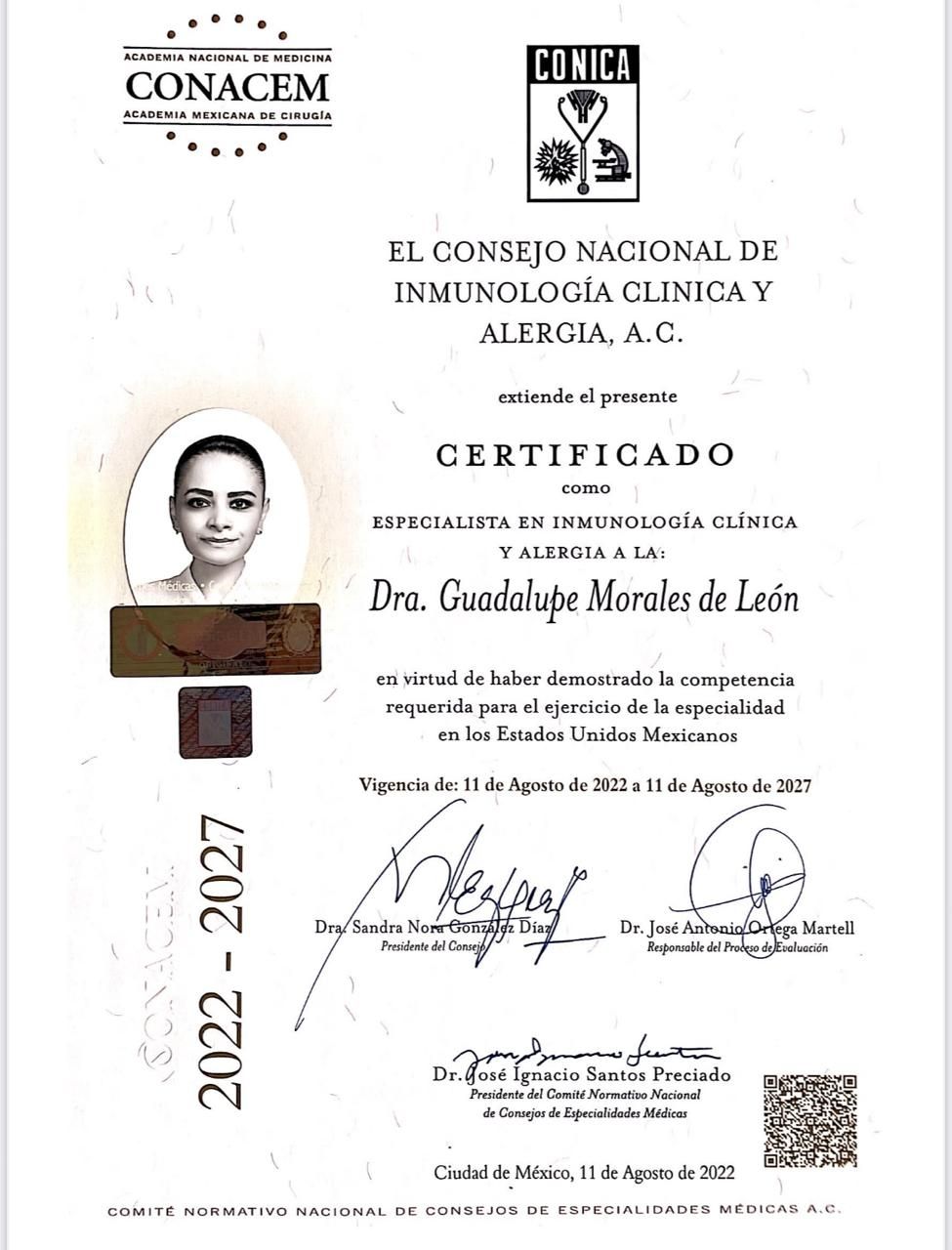 La Dra. Guadalupe Morales de León es una reconocida Alergóloga y Pediatra certificada por el Consejo Nacional de Inmunología Clínica y Alergia y por el Consejo Mexicano de Pediatría. La Dra. Lupita como le dicen de cariño sus pacientes y colegas, cuenta con más de 18 años de experiencia en la práctica médica particular e institucional, actualmente es profesora de las materias de Inmunología y Alergología en la Facultad de Medicina de la Benemérita Universidad Autónoma de Puebla, a su vez es Médico adscrito al servicio de Alergología del Hospital ISSSTEP y es la actual Presidenta del Colegio de Alergia e Inmunología de Puebla, capítulo centro, CMICA (Colegio Mexicano de Inmunología Clínica y Alergia) 2024-2025. La Dra. Morales de León es Speaker para Laboratorios Farmacéuticos Transnacionales. Es Maestra en Ciencias Avanzadas de la Nutrición Humana realizada en la Universidad Internacional de Valencia, además de haber realizado el Máster en Microbiota, Probióticos y Prebióticos en la Universidad Europea de Madrid. También ha realizado el Máster en Medicina Antienvejecimiento y Longevidad en la Universidad de Barcelona. Su trabajo se ha publicado en revistas y libros de relevancia médica enfocados en su especialidad. Su más reciente participación fue como coautora en el libro de Alergia Alimentaria: de la teoría a la práctica editado por graphimedic 2023 y como autora en: Modulación de la microbiota intestinal y la reparación de la barrera intestinal en la prevención y el tratamiento de las alergias alimentarias publicado en Anales de Microbiota, Probióticos & Prebióticos 2023. Además de haber participado como coautora en el libro Inmunoalergia para médicos de primer contacto, publicado por la editorial Nieto editores 2021. La Dra. Morales de León pertenece a los siguientes colegios y sociedades tanto nacionales como internacionales: EAACI - European Academy of Allergy and Clinical Immunology COMPEDIA - Colegio Mexicano de Pediatras Especialistas en Inmunología Clínica y Alergia CMICA - Colegio Mexicano de Inmunología Clínica y Alergia CAIP - Colegio de Alergia e Inmunología de Puebla SEMIPyP - Sociedad Española de Microbiótica, Probióticos y Prebióticos SoMeMi: Sociedad Mexicana de Microbiota Colegio de Pediatría del Estado de Puebla