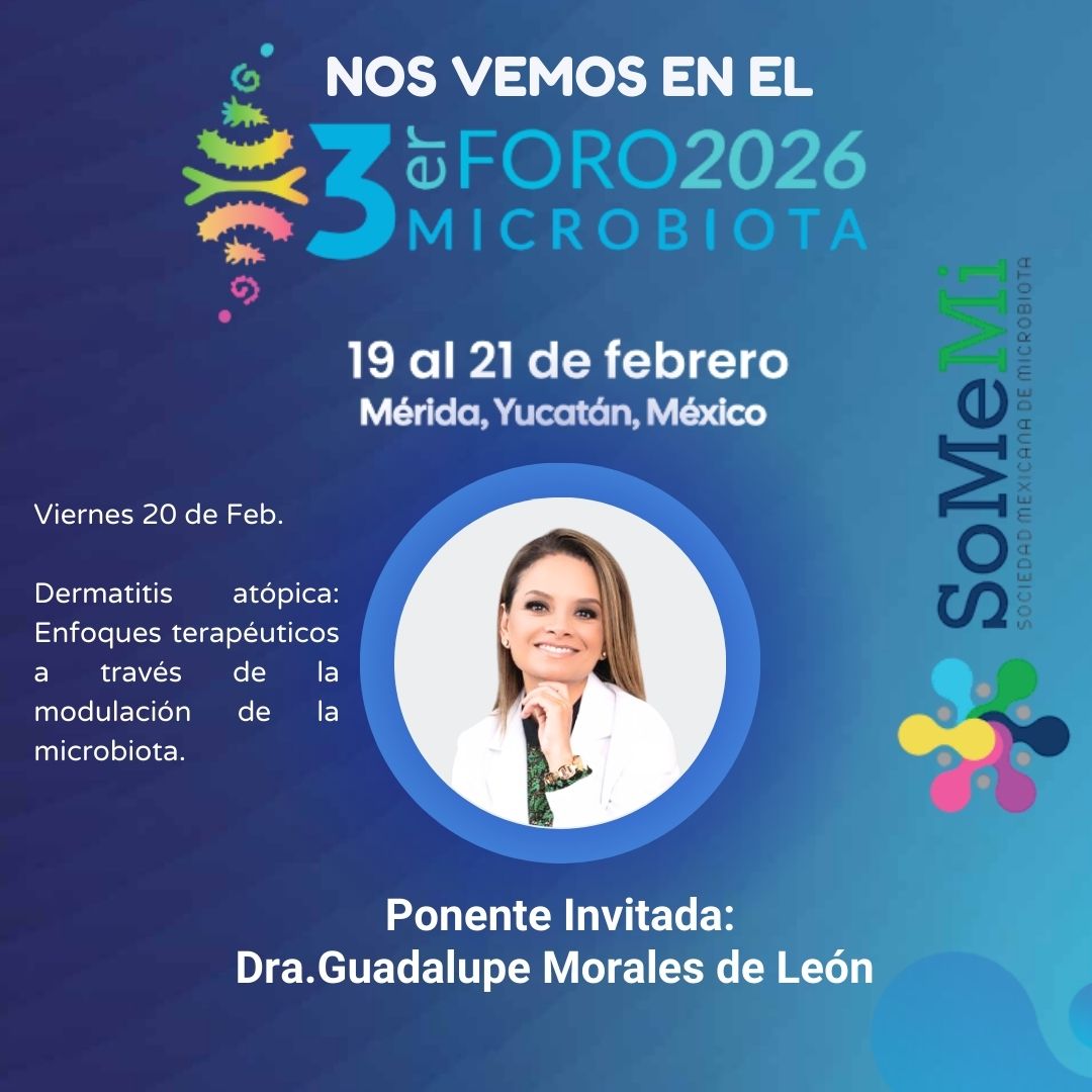 Esta semana, estará participando como ponente en el Tercer Foro Internacional de Microbiota 2026 en Mérida, organizado por la Sociedad Mexicana de Microbiota( SoMeMi) donde impartirá la conferencia: “Dermatitis atópica: Enfoques terapéuticos a través de la modulación de la microbiota”