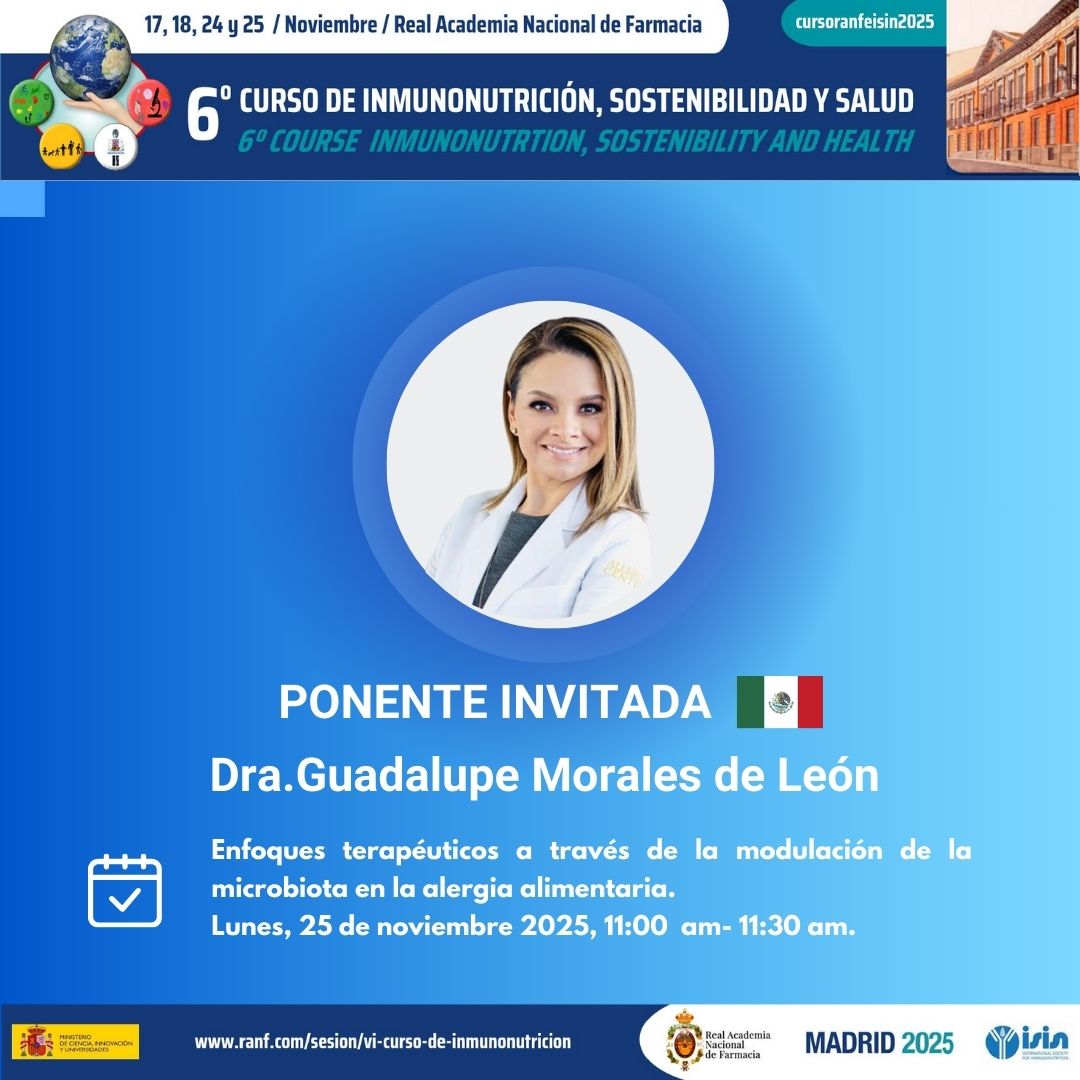 Ponencia de la Dra. Guadalupe Morales de León, en el VI Curso de Inmunonutrición, Sostenibilidad y Salud, realizado en Madrid, España del 18 al 25 de noviembre del presente año. Organizado por la Real Academia Nacional de Farmacia Española.
