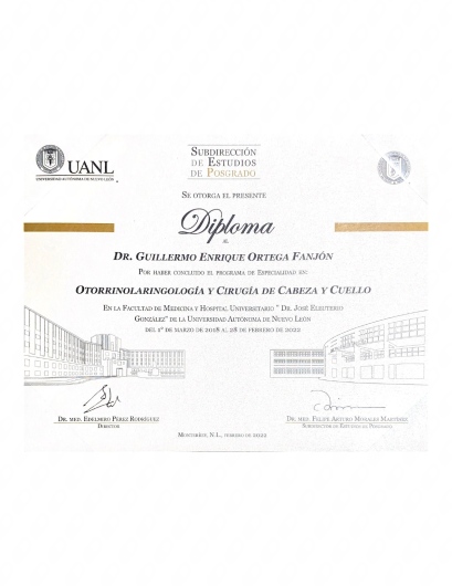 Especialista en diagnostico y tratamiento de enfermedades del oido, nariz, senos paransales, garganta y laringe en pacientes pediatricos y adultos.