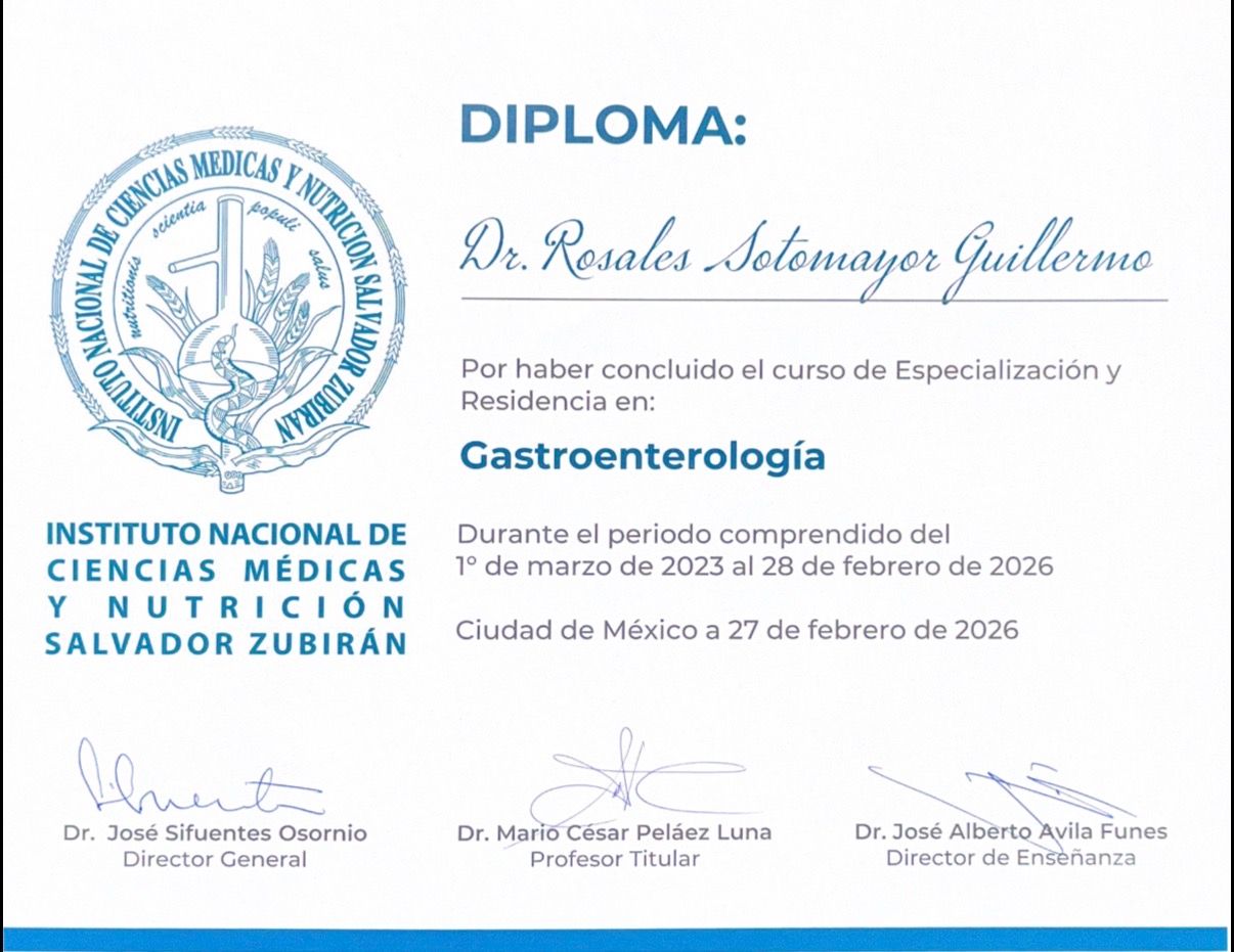 Hola, soy el Dr. Guillermo Rosales Sotomayor. Soy médico cirujano egresado de la Universidad Autónoma de Coahuila. Además, soy Médico Internista y Gastroenterólogo, formado en el Instituto Nacional de Ciencias Médicas y Nutrición Salvador Zubirán, una de las instituciones líderes en México y Latinoamérica. Mi práctica combina la medicina basada en evidencia con un trato humano y cercano.