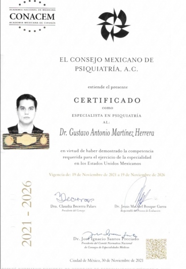 Médico con especialidad en Psiquiatría. Amplia experiencia en afecciones emocionales. Certificado por el Consejo Mexicano de Psiquiatría.