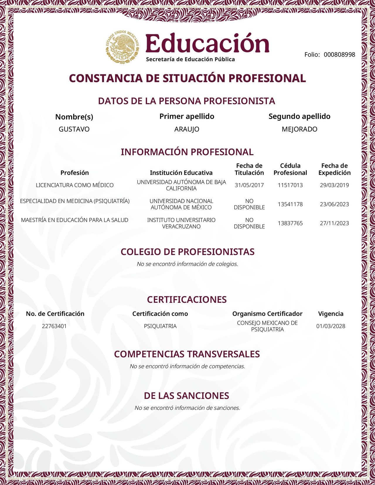 Recomiendo al Dr. Gustavo Araujo, gran atenciones al momentos de realizar mis preguntas y muy profesional.