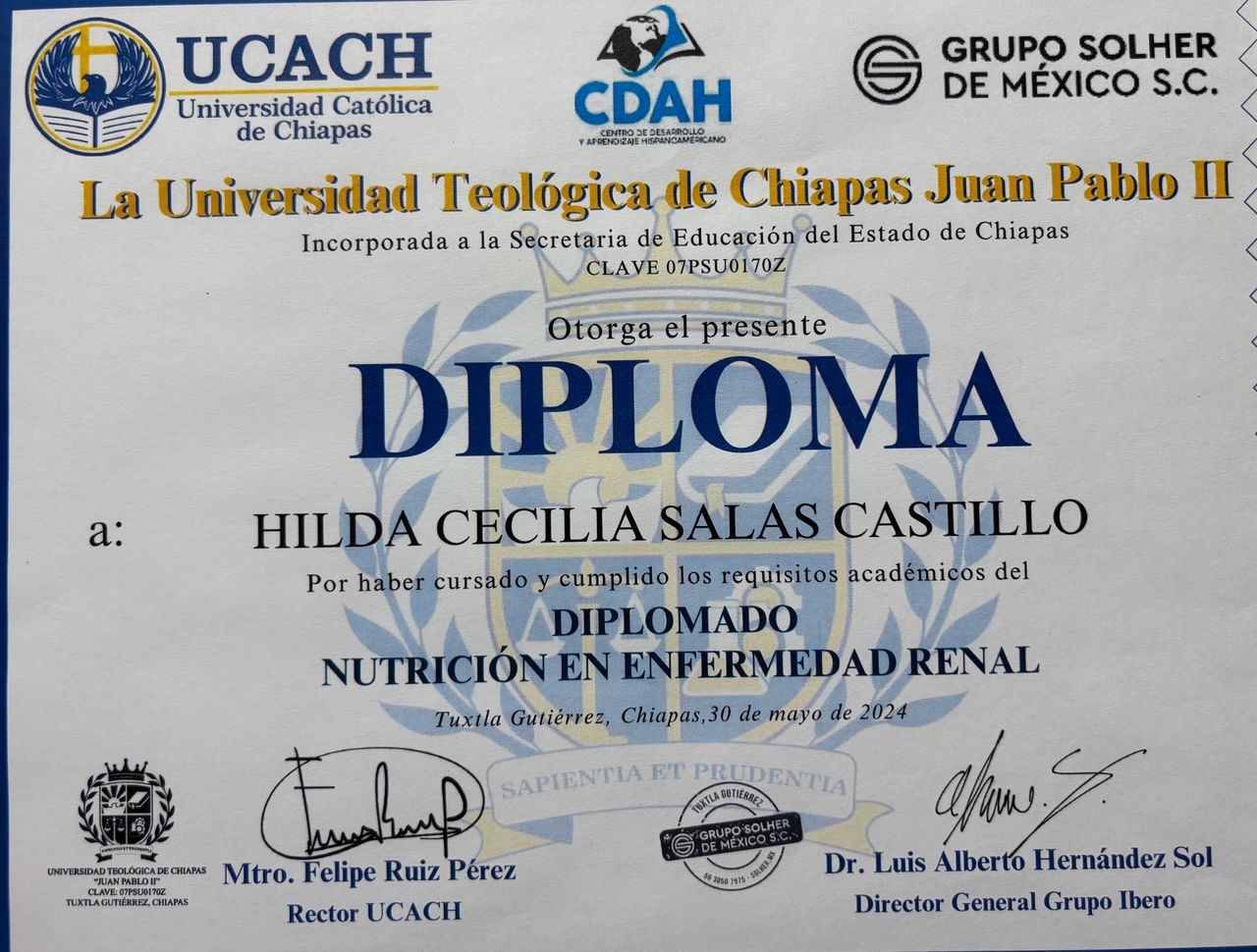 Algunos de los Diplomados que he realizado son: Diplomado de Educadora en Diabetes (Universidad Anáhuac 2022), Diplomado en Enfermedad Renal (Centro de Desarrollo y Aprendizaje Hispanoamericano 2023) mi enfoque es clínico, esto me permite abordar mejor la enfermedad y colaborar con médicos especialistas en cada área.