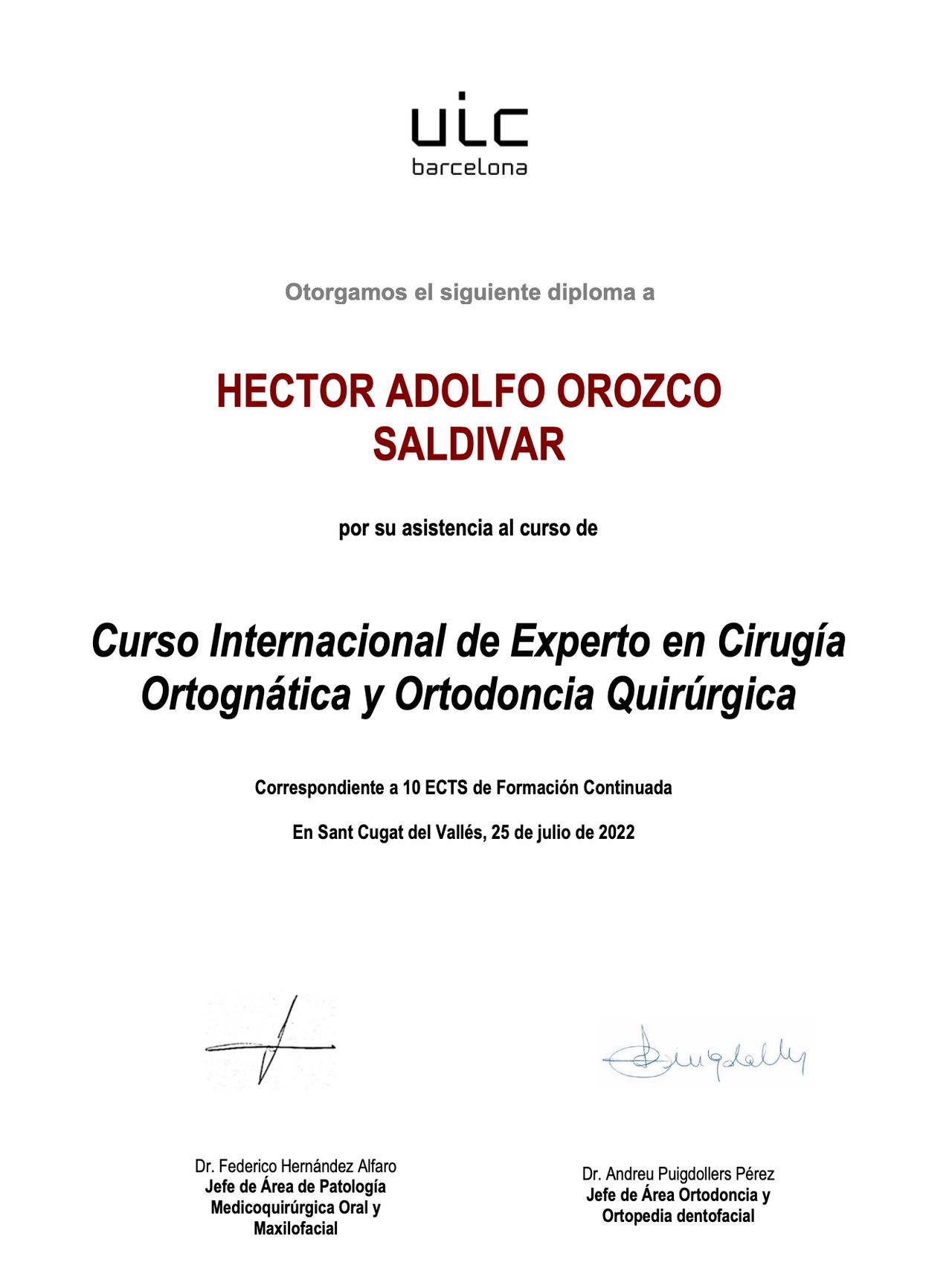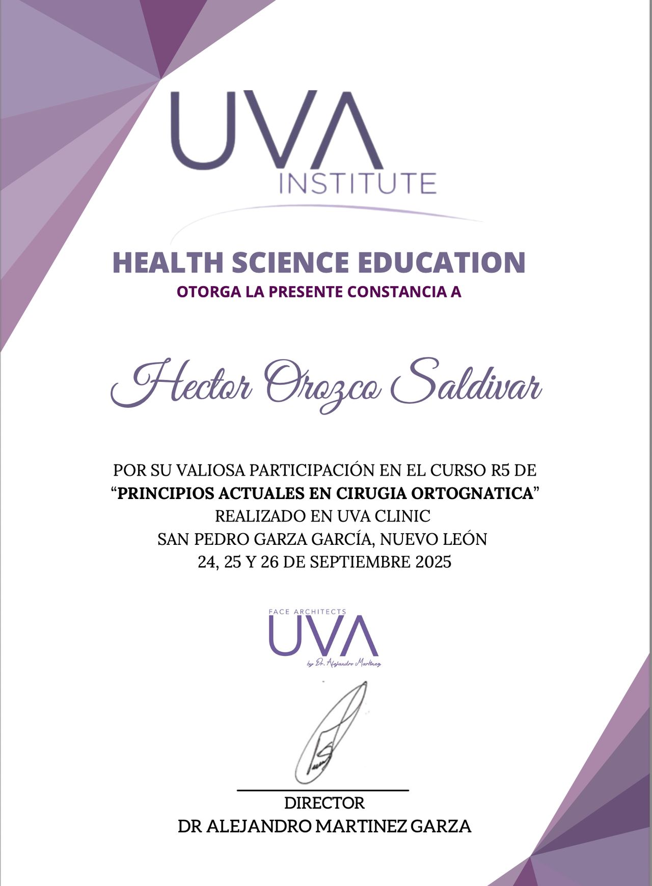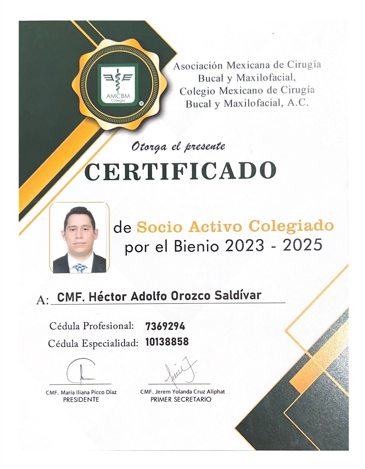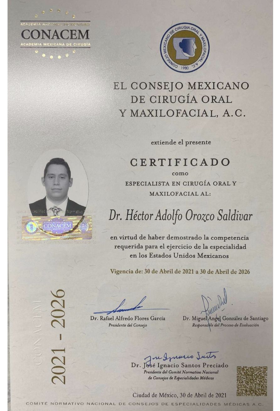 Doctor Hector A, Orozco Saldivar, es Cirujano Dentista Egresado de la Facultad de Odontología de la UANL en el 2010, Realiza la especialidad en Cirugía Oral y Maxilofacial en el Centro Medico Nacional "20 de Noviembre " ISSSTE/UNAM. 2012 al 2016. Actualmente Re-certificado por el Consejo Mexicano de Cirugia Oral y Maxilofacial/CONACEM y es Miembro de la Asociación Mexicana de Cirugia Bucal y Maxilofacial, Miembro de la asociación latinoamericana de cirugía y traumatología bucomaxilofacial Realiza entrenamientos en el area de la Implantologia Quirurgica y Protesica (Instituto de Implant XP/UDEM, Preseptorado en Cirugía Cosmética y Rejuvenecimiento facial ( Dr. Joe Niamtu. / Saint Louis Missouri University. EUA 2021), Cursos de cirugia Ortognatica en el extranjero ( UIC Barcelon / curso internacional de experto en cirugía ortognatica y ortodoncia quirúrgica / 2022 ) ( rotación en el hospital policlínico G.B / Universidad de Verona / 2023) ( FACE Surgery Prof: Mirco Raffaini/ Milan/pharma 2025 ) ( UIRMI/ INSTITUTO DE IMPLANTOLOGIA Eduardo Anitua / Vitoria Gasteis 2020 y 2025 . Ha realizado publicaciones nacionales e internacionales con temas diversos como Infiltración de Toxina Botulinica como tratamiento en Dolor Miofascial , ´ Injertos Interposicionales de Rama Mandibular durante Cirugia Ortognatica y Reporte de caso de síndrome de Ramsay Hunt. Fue profesor de Cirugía Bucal y Patología Oral en la Facultad de Odontología y en el Posgrado de Cirugía Oral y Maxilofacial / UANL ( 2018 - 2021 ) y formo parte del Comité organizador del Curso de Cirugia Ortognatica / ISSSTE Regional / Monterrey. Actualmente realiza su práctica privada exclusiva a la Cirugía Maxilofacial Estética y Funcional como Director de la Clínica de Cirugía oral y Maxilofacial en Face & Bite Clinic, en Monterrey Nuevo Leon.