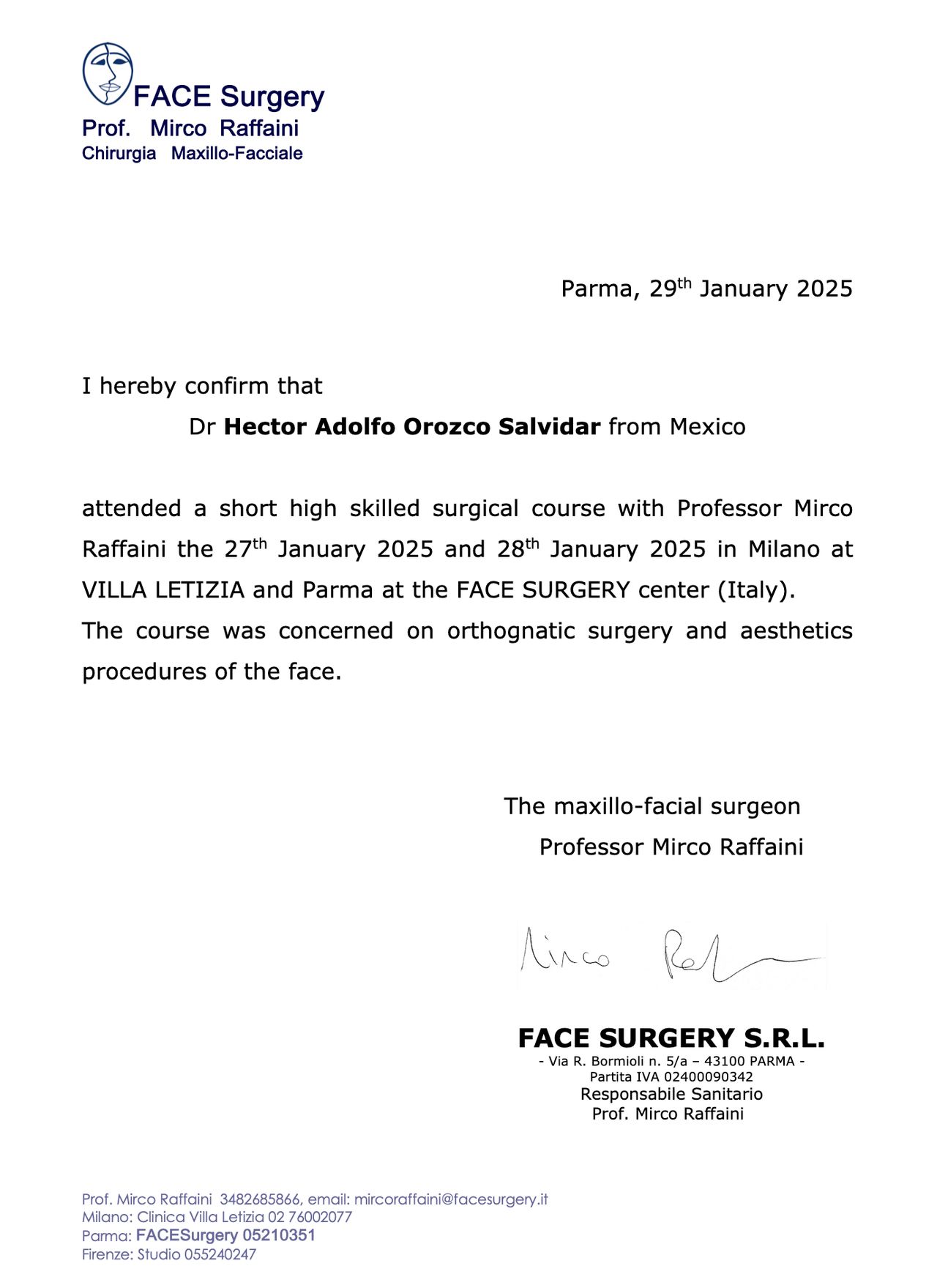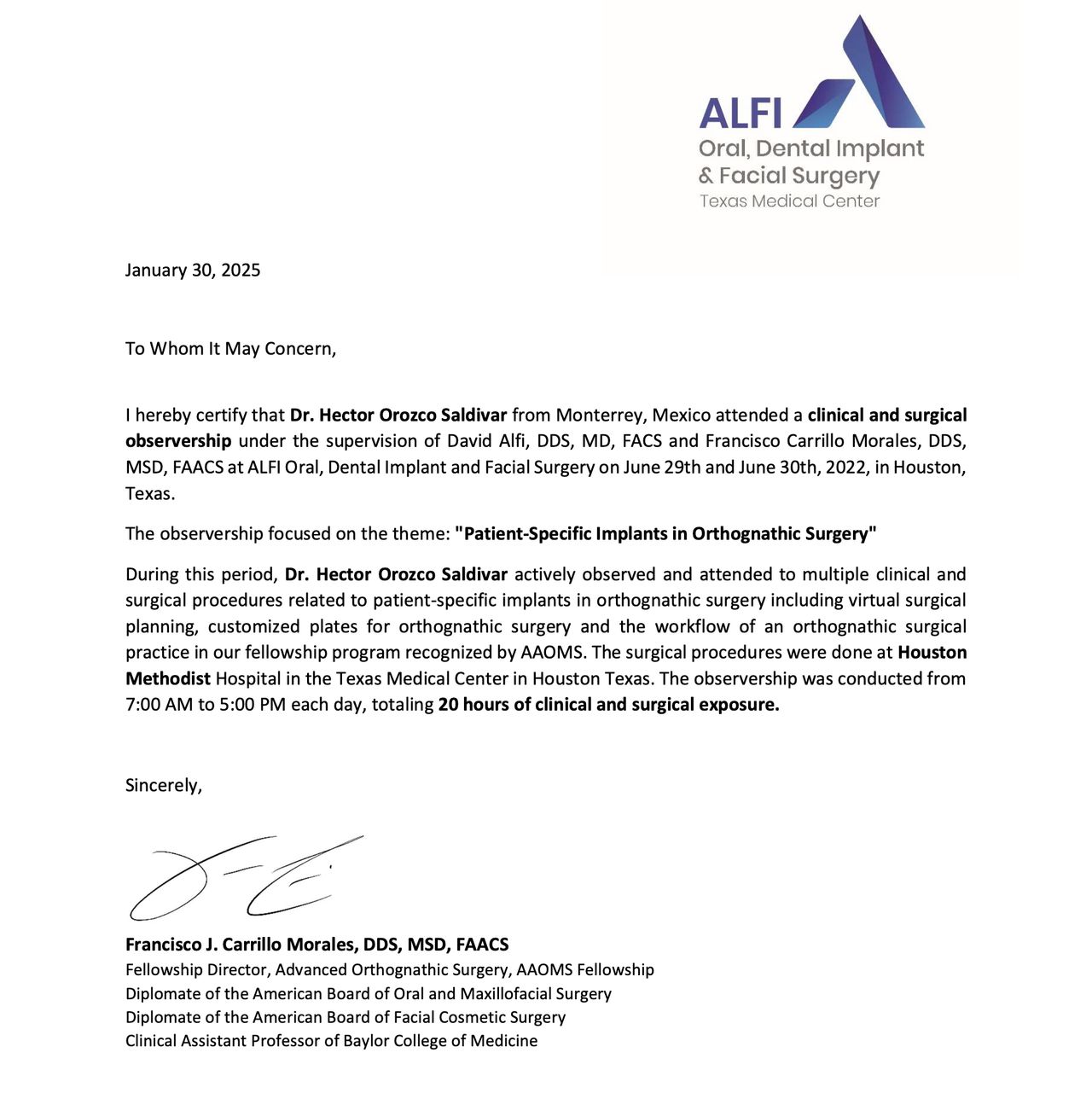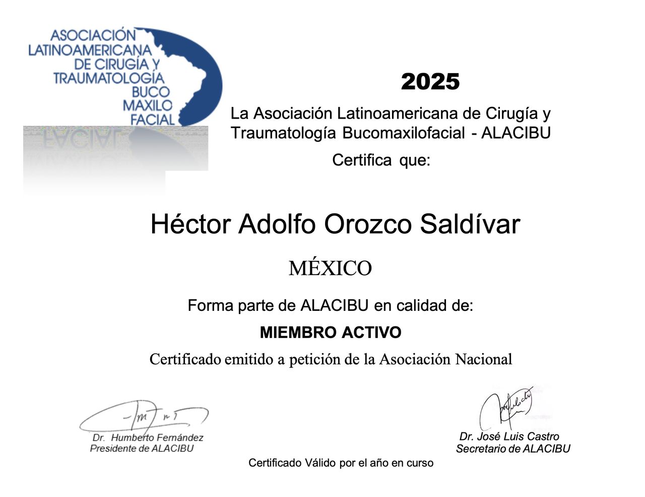 Doctor Hector A, Orozco Saldivar, es Cirujano Dentista Egresado de la Facultad de Odontología de la UANL en el 2010, Realiza la especialidad en Cirugía Oral y Maxilofacial en el Centro Medico Nacional "20 de Noviembre " ISSSTE/UNAM. 2012 al 2016. Actualmente Re-certificado por el Consejo Mexicano de Cirugia Oral y Maxilofacial/CONACEM y es Miembro de la Asociación Mexicana de Cirugia Bucal y Maxilofacial, Miembro de la asociación latinoamericana de cirugía y traumatología bucomaxilofacial Realiza entrenamientos en el area de la Implantologia Quirurgica y Protesica (Instituto de Implant XP/UDEM, Preseptorado en Cirugía Cosmética y Rejuvenecimiento facial ( Dr. Joe Niamtu. / Saint Louis Missouri University. EUA 2021), Cursos de cirugia Ortognatica en el extranjero ( UIC Barcelon / curso internacional de experto en cirugía ortognatica y ortodoncia quirúrgica / 2022 ) ( rotación en el hospital policlínico G.B / Universidad de Verona / 2023) ( FACE Surgery Prof: Mirco Raffaini/ Milan/pharma 2025 ) ( UIRMI/ INSTITUTO DE IMPLANTOLOGIA Eduardo Anitua / Vitoria Gasteis 2020 y 2025 . Ha realizado publicaciones nacionales e internacionales con temas diversos como Infiltración de Toxina Botulinica como tratamiento en Dolor Miofascial , ´ Injertos Interposicionales de Rama Mandibular durante Cirugia Ortognatica y Reporte de caso de síndrome de Ramsay Hunt. Fue profesor de Cirugía Bucal y Patología Oral en la Facultad de Odontología y en el Posgrado de Cirugía Oral y Maxilofacial / UANL ( 2018 - 2021 ) y formo parte del Comité organizador del Curso de Cirugia Ortognatica / ISSSTE Regional / Monterrey. Actualmente realiza su práctica privada exclusiva a la Cirugía Maxilofacial Estética y Funcional como Director de la Clínica de Cirugía oral y Maxilofacial en Face & Bite Clinic, en Monterrey Nuevo Leon.