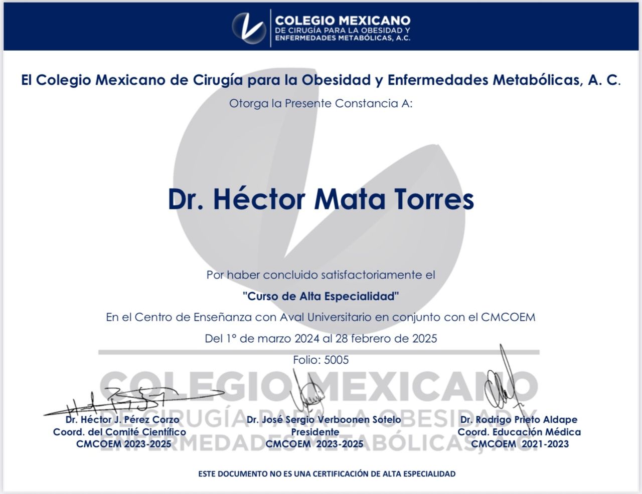 Actualmente miembro del ¨Colegio Mexicano para de cirugía para la obesidad y enfermedades metabólicas¨ así como miembro de la ¨Asociación Mexicana de cirugía general¨ con certificación vigente por CONACEM.