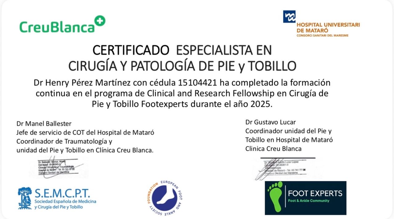 Fellowship en cirugía de pie y tobillo en Barcelona, España en el Hospital Creu Blanca y Consorci Sanitari del Maresme Mataró con el Dr. Manel Ballester y Dr. Gustavo Lucar.