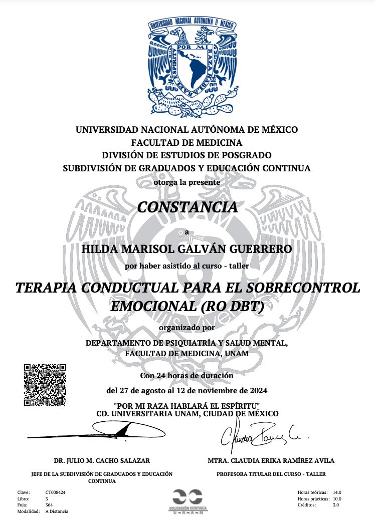 La dra. Hilda me sacó de una etapa con muchísima ansiedad. Yo ya no podía ni salir a la calle y en cuestión de nada, agendé cita, me atendió lindísima y muy profesional, empecé mi tratamiento y pude volver a la normalidad. Siempre estaré muy agradecida con ella.