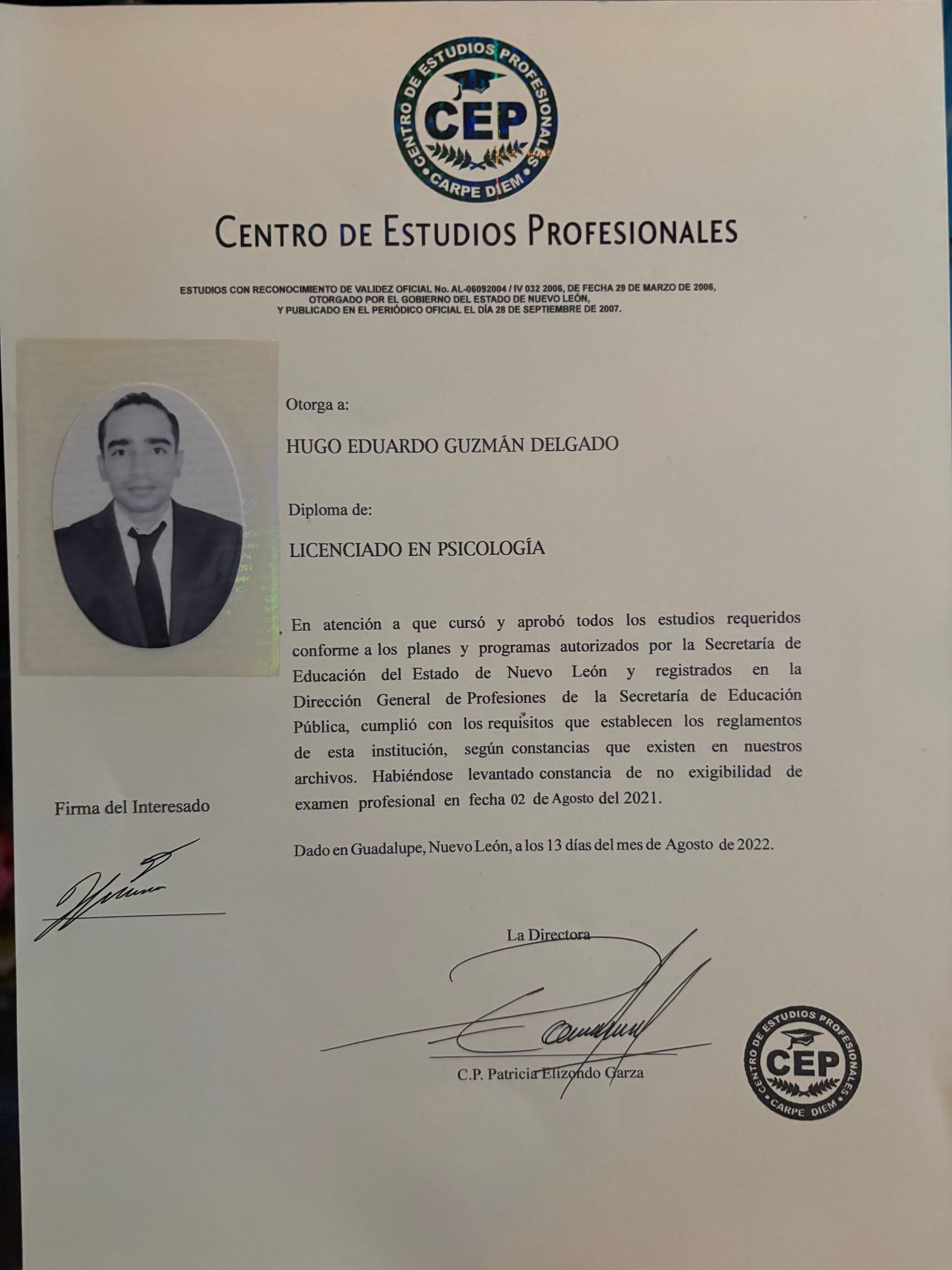 Soy Licenciado en Psicología, cédula profesional 13819993.