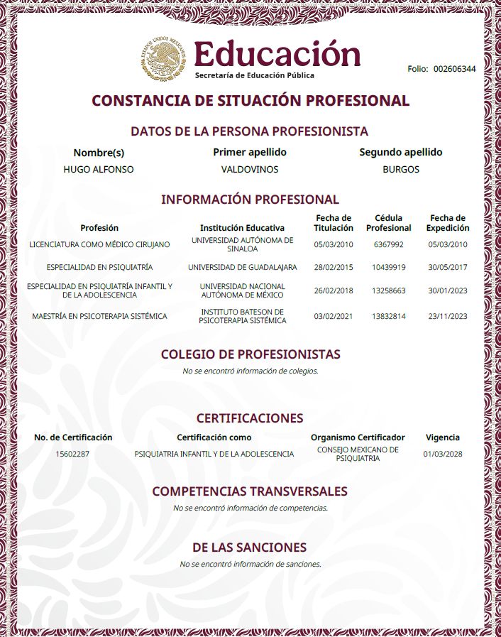 ¡Bienvenidos! Mi nombre es Hugo Valdovinos, soy psiquiatra con una gran pasión por ayudar a las personas a mejorar su salud mental y emocional. Ofrezco servicios de evaluación médico-psiquiátrica y tratamiento personalizado para cada uno de mis pacientes.
