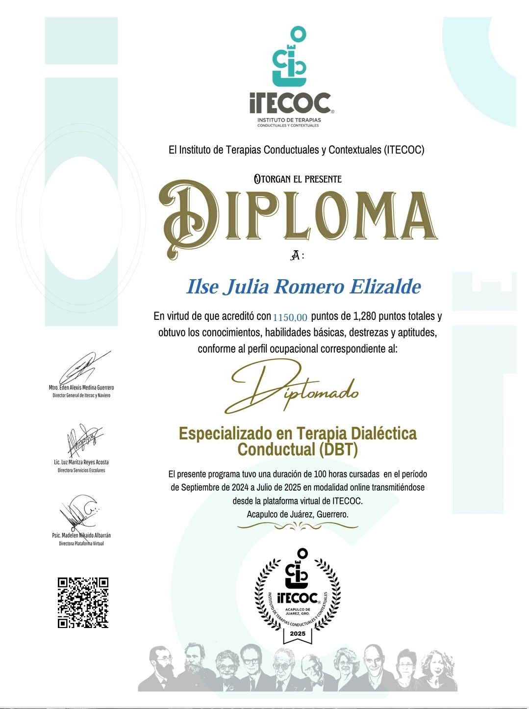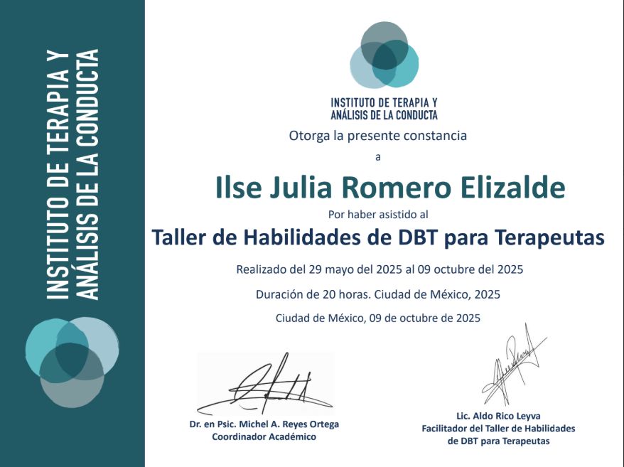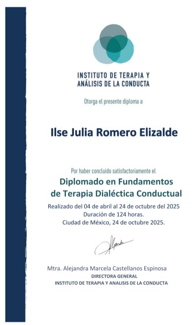 Psicóloga Conductual-Contextual Terapia de Aceptación y Compromiso (ACT); Terapia Dialéctico Conductual (DBT). Docente en la Federación Mexicana de Psicología.
