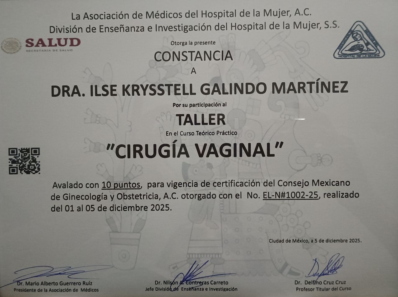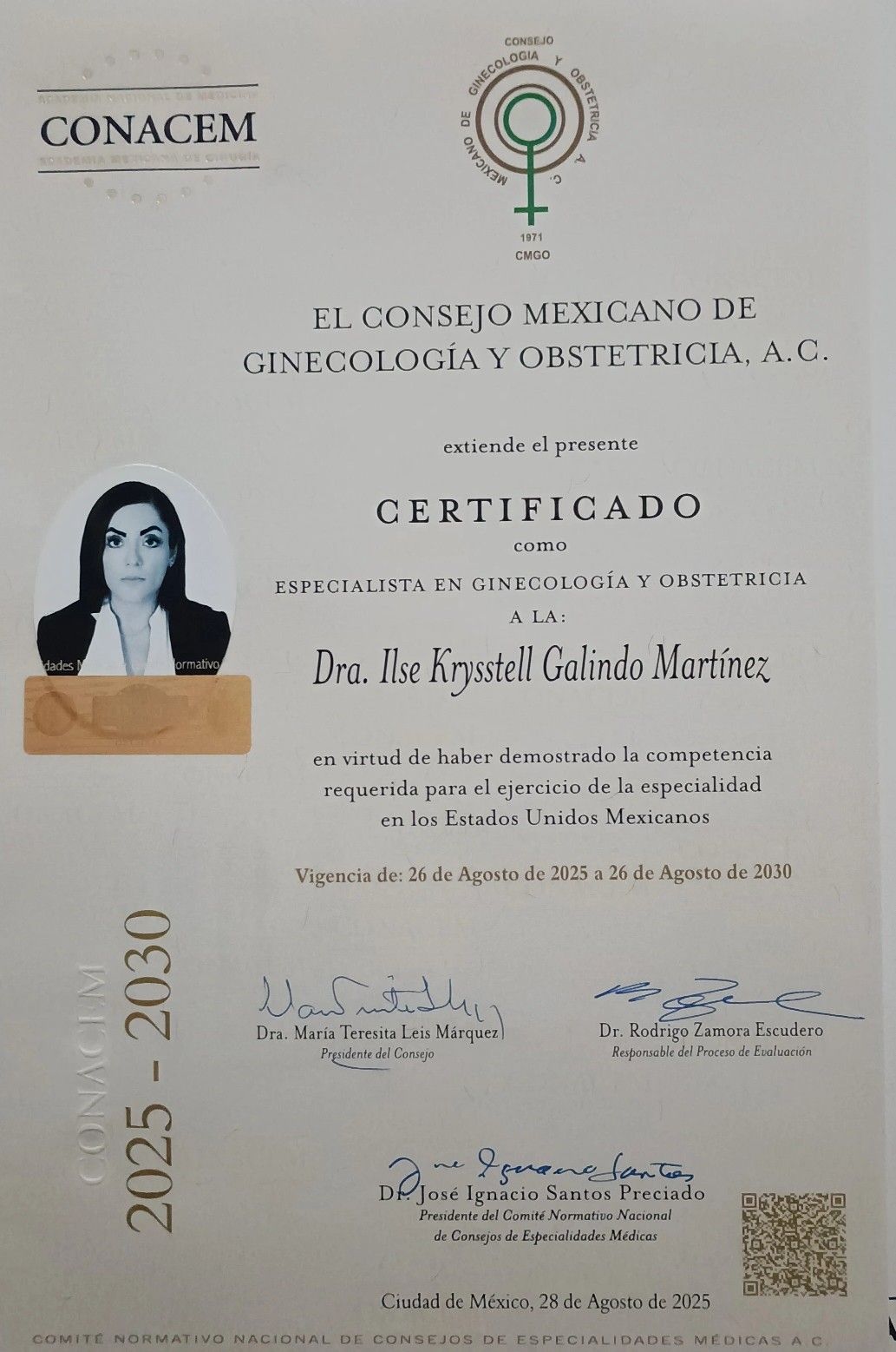 2025-2030 lo cual significa que este organismo válida que un ginecólogo tiene el conocimiento y la experiencia para así, ejercer su especialidad ya sea, en su práctica médica privada o Institucional . De igual forma me encuentro tomando constantemente actualizaciones, lo que contribuye a que todas mis pacientes reciban una atención médica adecuada.