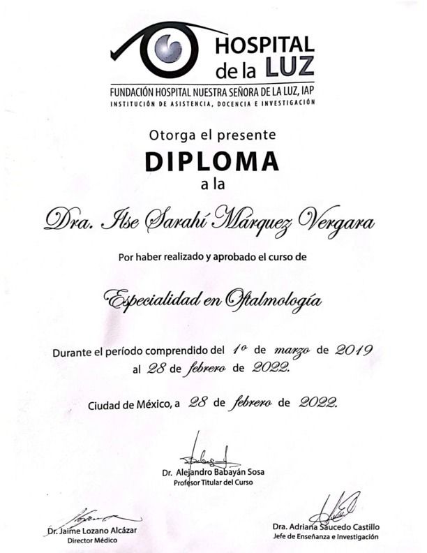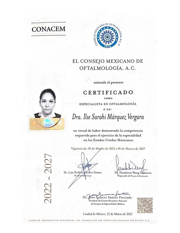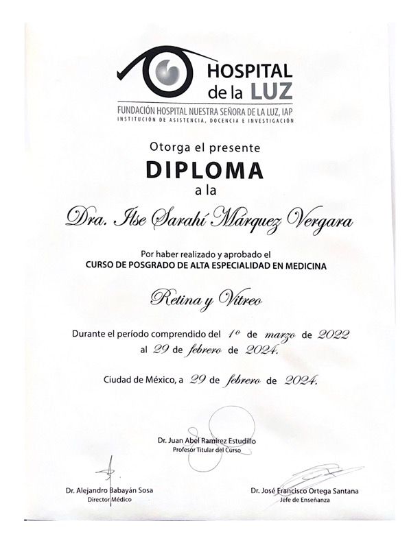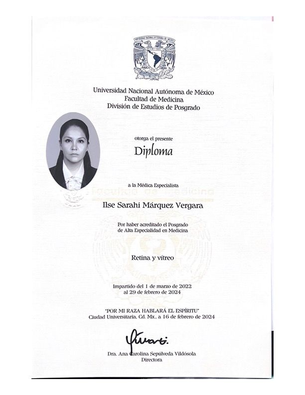 Estoy certificada por el Consejo Mexicano de Oftalmología, soy profesora en Alta Especialidad en Retina en el programa académico de la Universidad de Westhill, lo que me permite ofrecer a mis pacientes las mejores actualizaciones en tratamientos y diagnósticos de vanguardia.