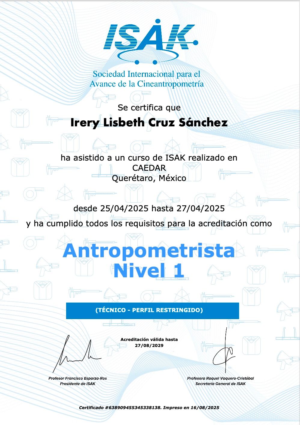 Cuento con equipo especializado para realizar una valoración nutricional completa y diseñar planes de alimentación personalizados. Mi objetivo es ayudarte a mejorar tu salud de forma segura, realista y sostenible.