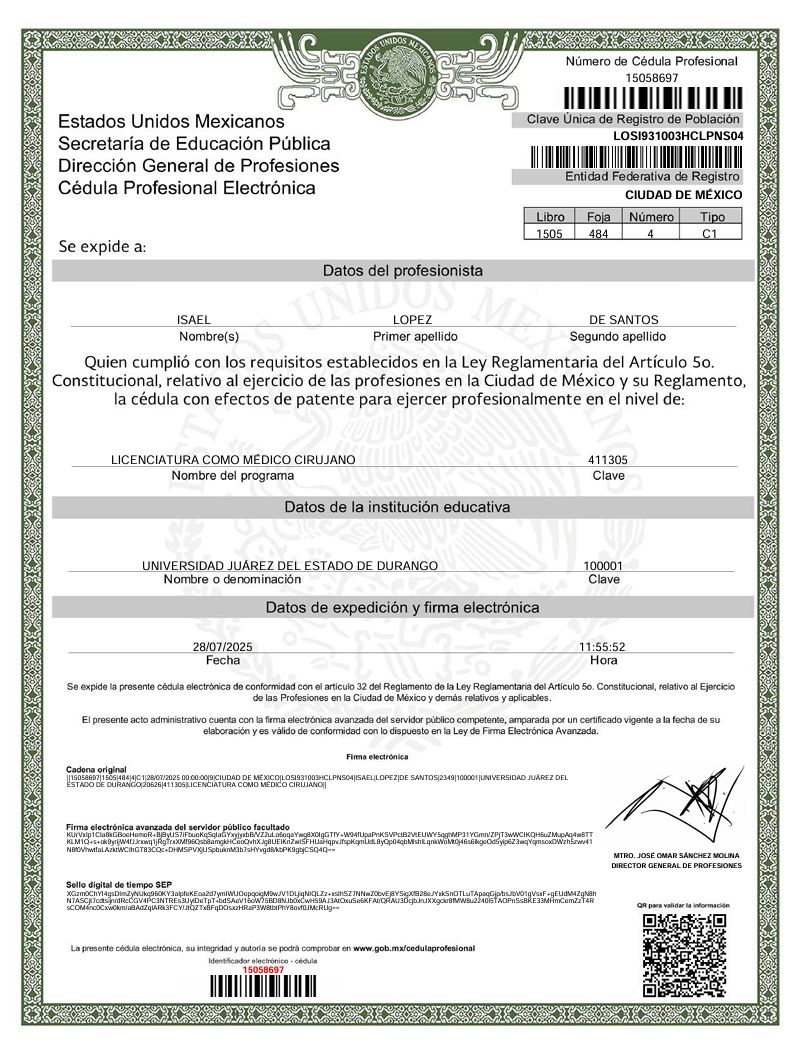 Soy el Dr. Isael López, médico internista con enfoque en el diagnóstico inicial, el control integral de enfermedades crónicas y la valoración clínica preoperatoria, así como el seguimiento posoperatorio. Atiendo por videollamada o chat a pacientes con presión arterial elevada, alteraciones de glucosa, colesterol y triglicéridos altos, enfermedad tiroidea, fatiga, mareos, palpitaciones, problemas circulatorios y síntomas físicos asociados a ansiedad.