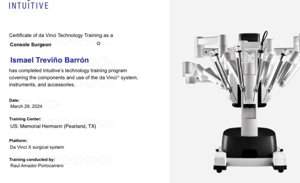 Soy Cirujano General con adiestramiento en cirugía laparoscópica avanzada y cirugía robótica. Certificado por Intuitive para operar con el robot Da Vinci y certificado por el Consejo Mexicano de Cirugía General.