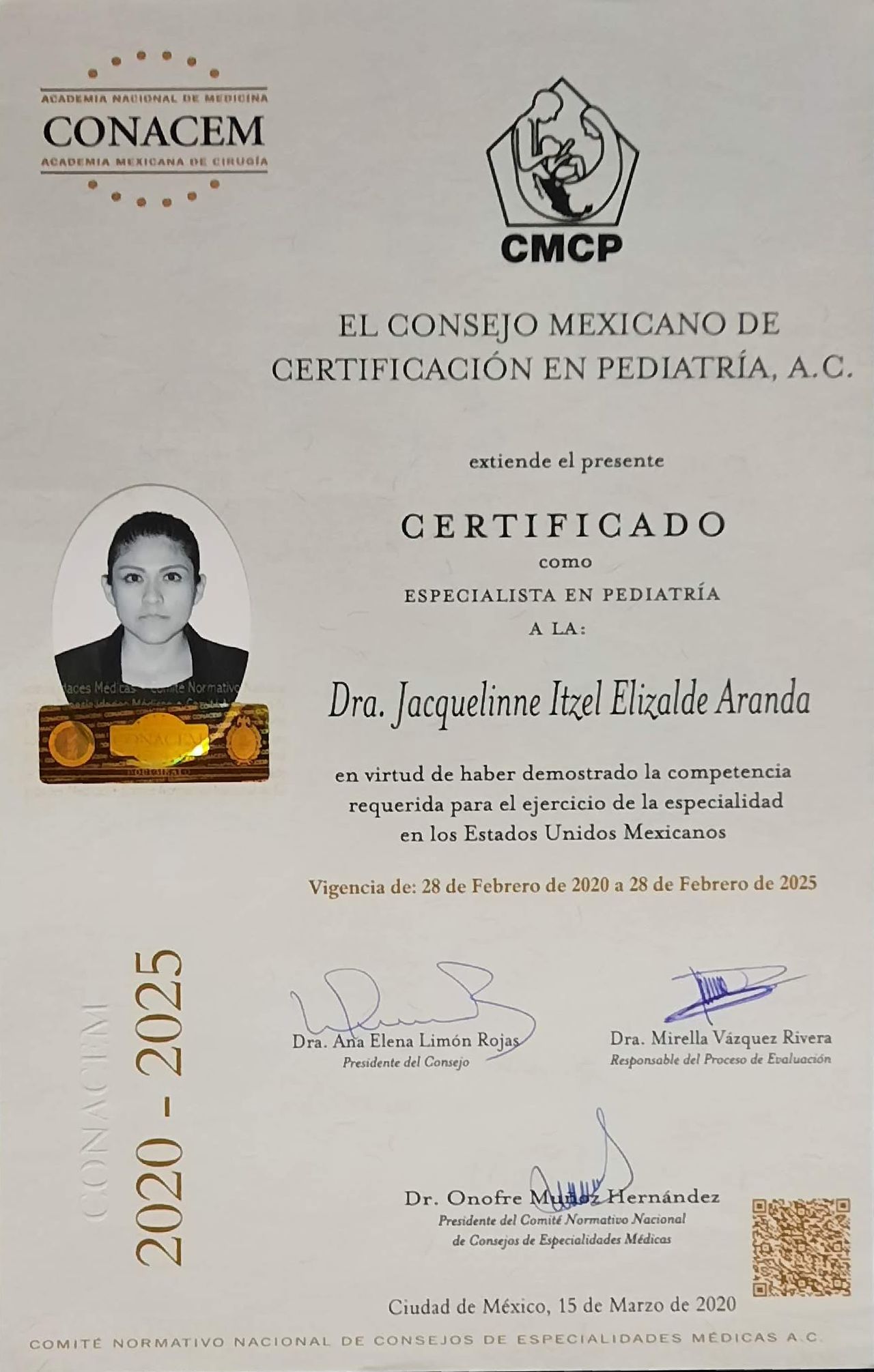 Realicé mis estudios de especialidad y subespecialidad en algunos de los mejores hospitales del país; cuento con certificación de ambas especialidades y me mantengo en actualización continuar para otorgarle a los niños la mejor atención posible.