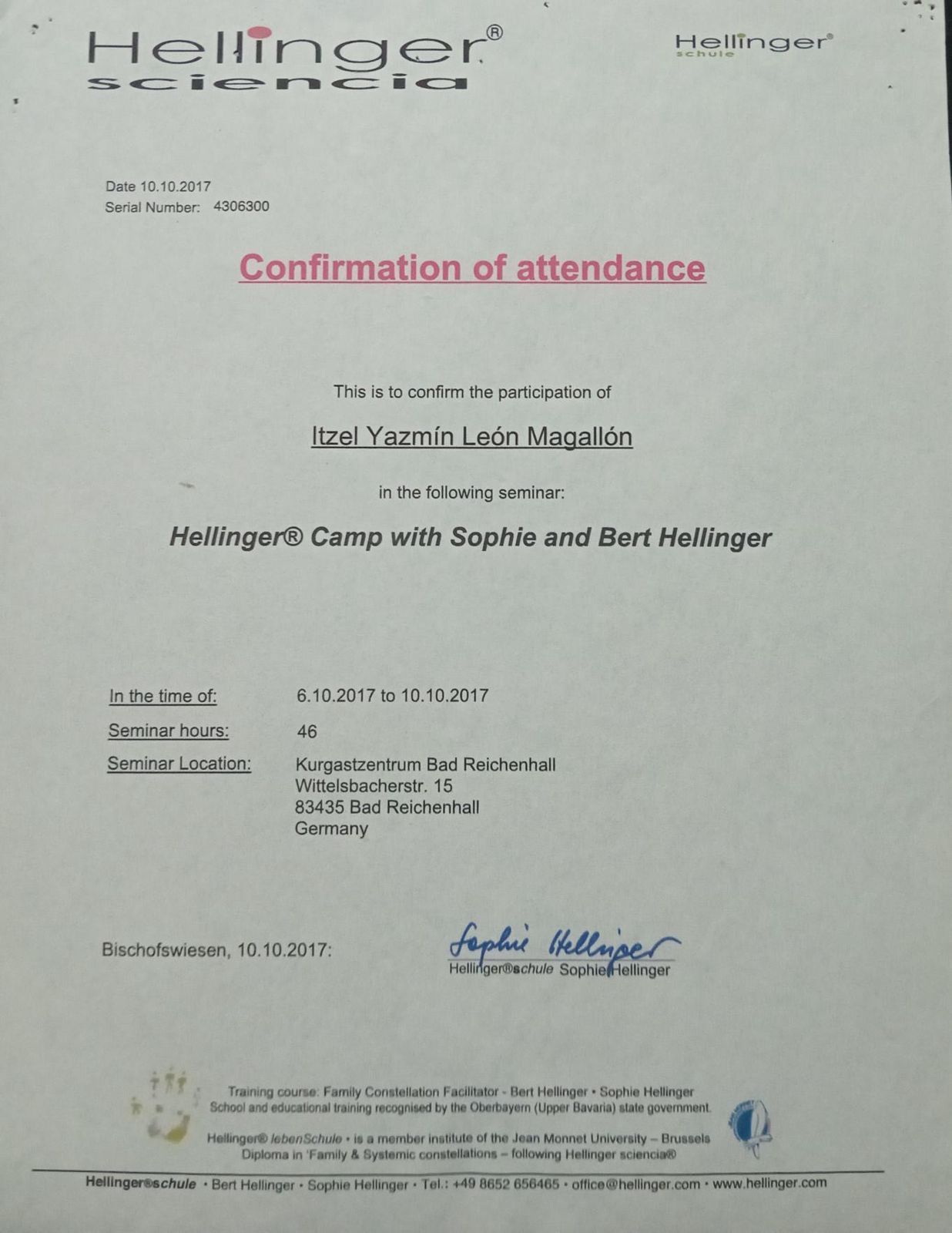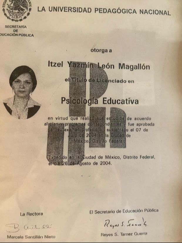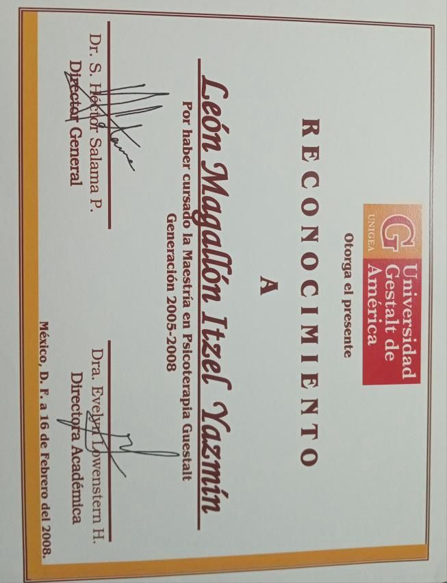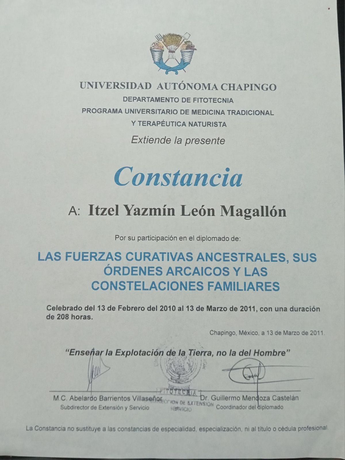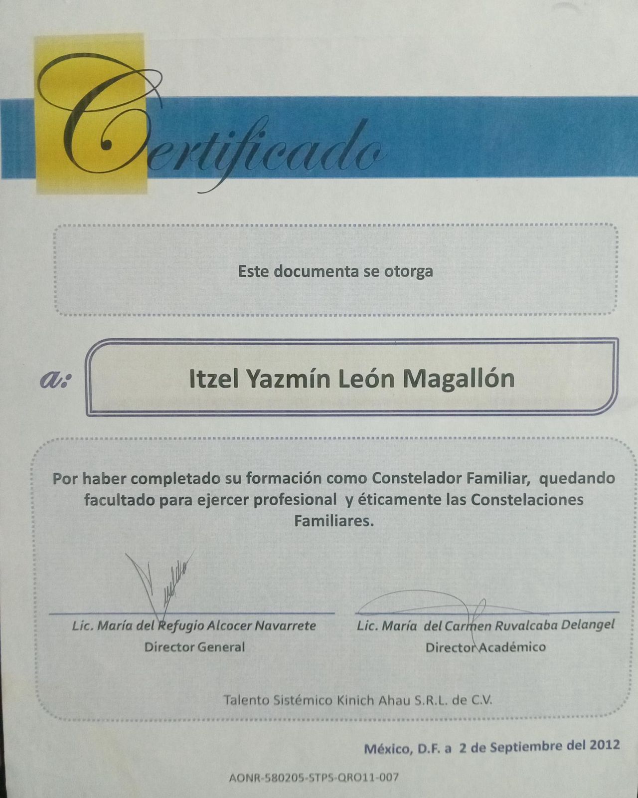 LA MTRA. ITZEL Y. LEÓN MAGALLÓN, ME HA GUIADO MEDIANTE SU GRAN CONOCIMIENTO Y MANEJO EN CONSTELACIONES FAMILIARES Y SU CERCANÍA Y CONOCIMIENTO ME HA AYUDADO EN MI VIDA DIARIA. EN UN MOMENTO MUY CRUCIAL DE CONFUSIÓN CON SU CAPACIDAD ME AYUDÓ A CANALIZAR MI SITUACIÓN Y A MEJORAR DEFINITIVAMENTE. GRACIAS.