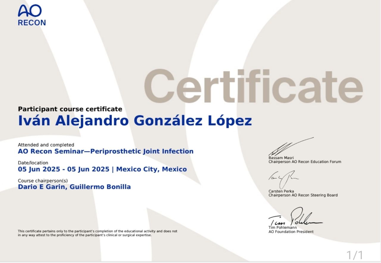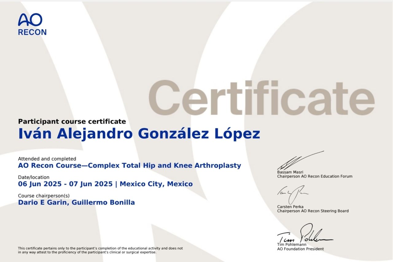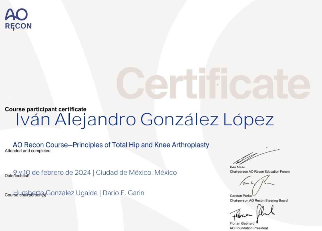 Durante mi especialidad realicé múltiples procedimientos los cuales consistían en reemplazos articulares de hombro, rodilla, cadera, artroscopia de hombro, rodilla, cadera, codo, tobillo y muñeca, fracturas.