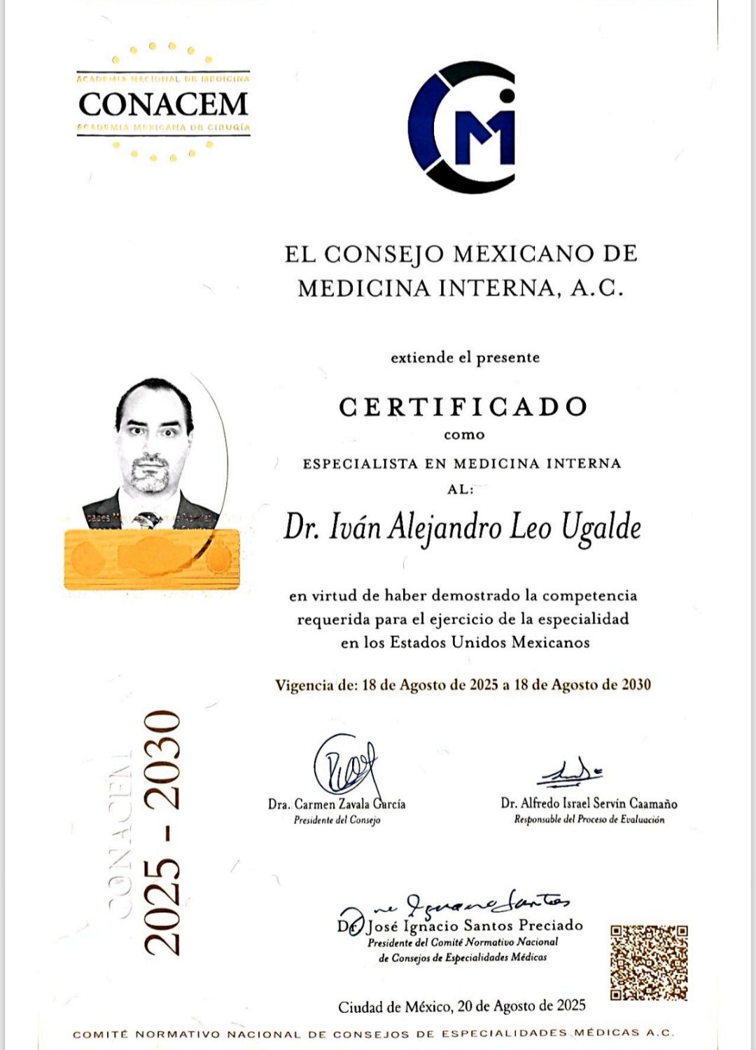Certificado por el Consejo Mexicano de Certificación en Infectología periodo 2023-2028, Cédula Profesional 11570361 Certificado por el Consejo Mexicano de Medicina Interna periodo 2025-2030. Cédula Profesional 11570361.