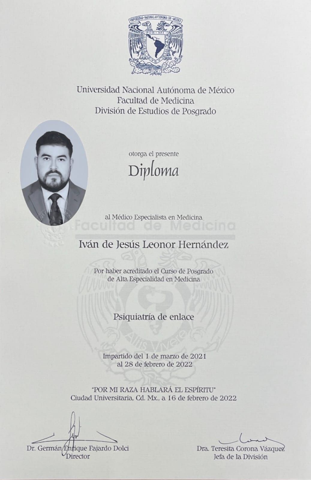 Soy Médico Especialista en Psiquiatría, egresado del Hospital Psiquiátrico Fray Bernardino Álvarez con aval de Universidad Nacional Autónoma de México.