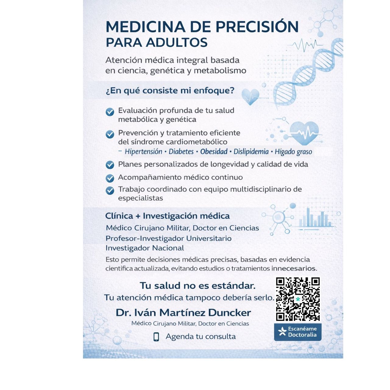 Ofrezco un enfoque de vanguardia, especialmente dirgido a prevenir y tratar eficientemente enfermedades crónicas metabólicas, incluyendo síndrome cardiometabólico (hipertensión, diabetes, obesidad, dislipidemia, hígado graso). Diseño planes individualizados de longevidad y calidad de vida, alineados con tus objetivos, tu estilo de vida y tus riesgos específicos.