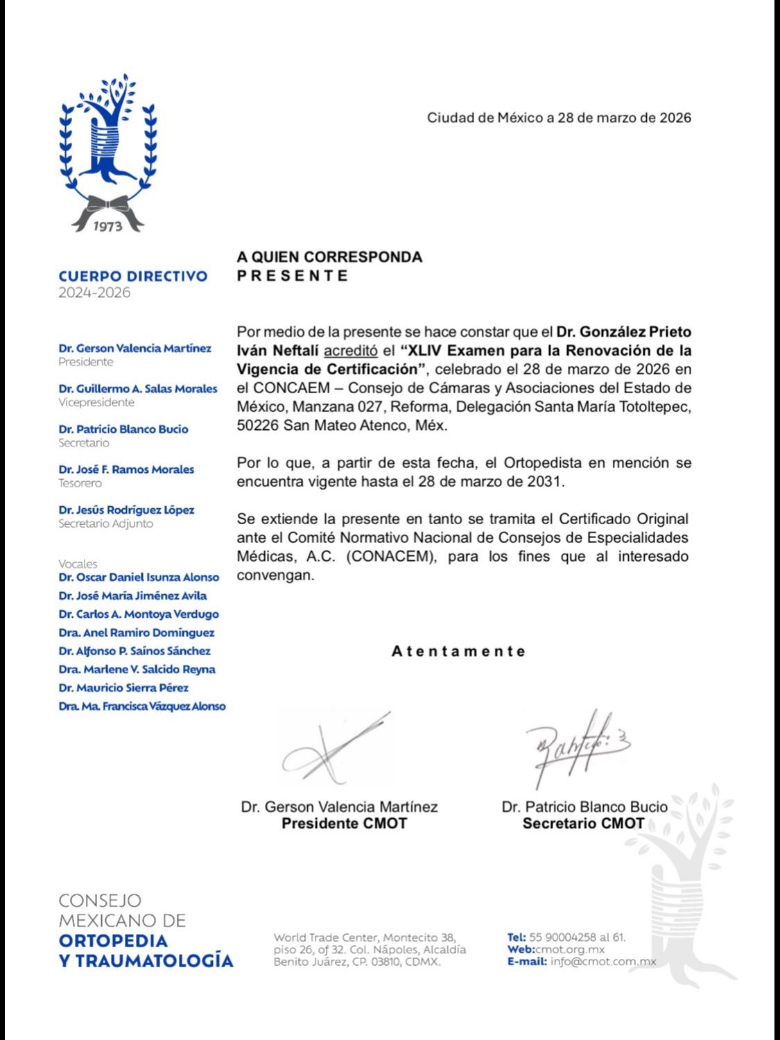 El Dr Iván González Prieto realizó la Licenciatura como Médico cirujano, en la Universidad La Salle Facultad Mexicana de Medicina. Realizó su Curso de Especialización en Traumatología y Ortopedia. Avalada por la UNAM.Cuenta con un Curso de Alta especialidad Reconstrucción Articular de cadera y Rodilla Egresado del INSTITUTO NACIONAL DE CIENCIAS MEDICAS Y NUTRICION SALVADOR ZUBIRAN. Es miembro del Colegio Mexicano de Ortopedia y Traumatología. Es miembro de la sociedad médica Grupo Ángeles. Cuenta con la certificación Zimmer Biomet. Certificado por el consejo mexicano de Ortopedia 2020-2025. 2026-2031
