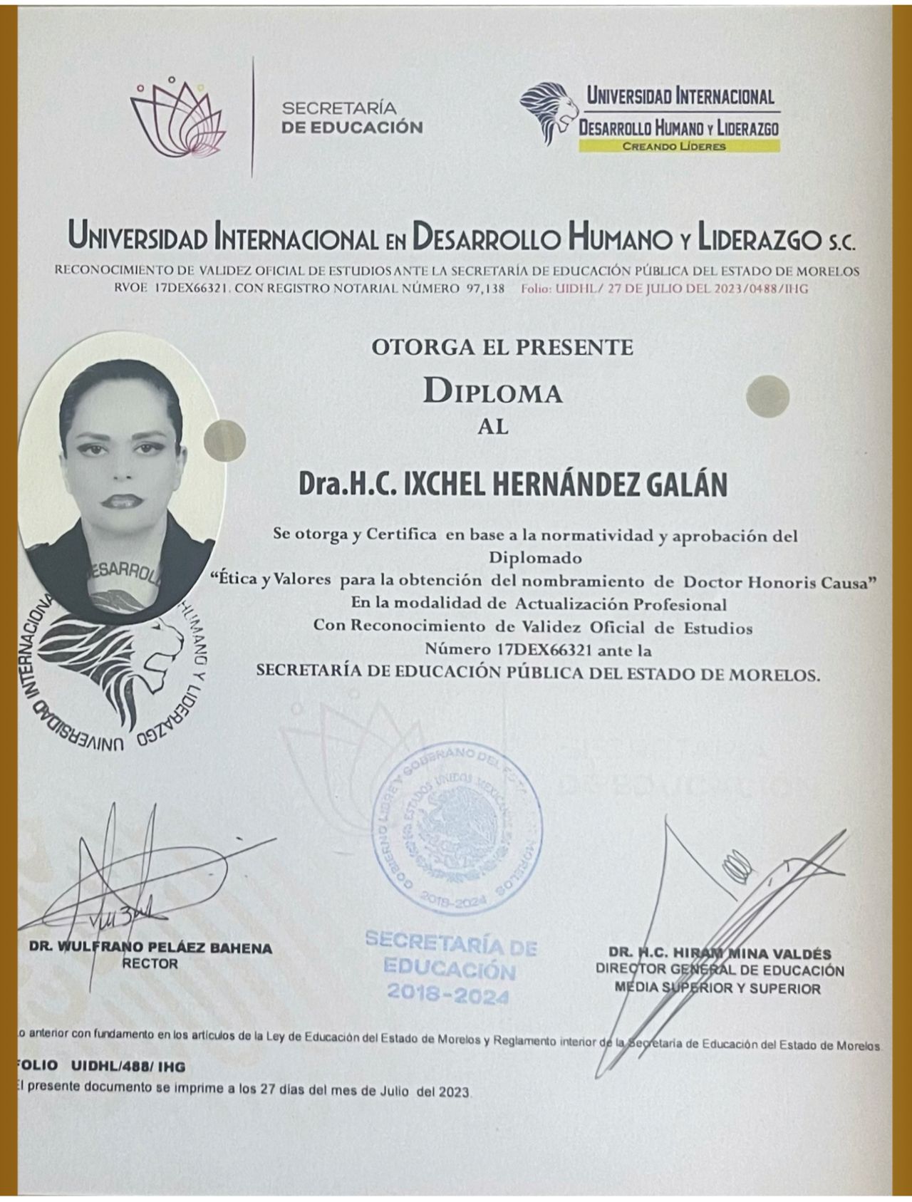 Más de 27 años de experiencia en consulta privada homeopática, organoterapia, terapia emocional con flores de Bach, iridología, escaneo biocuantico-magnetico, acupuntura, productos ortomoleculares y manejo de otras alternativas de la salud. Extensión universitaria de la UIDHL con REGISTRO DE LA SEP Y APOSTILLA DE LA HAYA para la impartición del DIPLOMADO DE HOMEOPATIA Y FLORES DE BACH con duración de un año. Doctora Honoris Causa y Doctor de doctores.