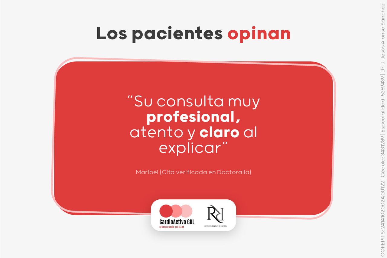 El Dr. J. Jesús Alonso Sánchez es un cardiólogo con más de 17 años de trayectoria en Medicina Interna, Cardiología Clínica y Rehabilitación Cardíaca en Guadalajara. Egresó de la Universidad de Guadalajara, se especializó en el Instituto Nacional de Cardiología "Ignacio Chávez" y cursó un fellowship en Rehabilitación Cardíaca en el Hospital San Francisco de Asís. Desde 2007 lidera el servicio de Rehabilitación Cardíaca en el Hospital Bernardette, ayudando a cientos de pacientes a recuperarse tras infartos y mejorar su salud cardiovascular.. Su perfil destaca por la empatía, claridad al explicar tratamientos y el seguimiento constante, respaldado por más de 733 opiniones positivas de pacientes satisfechos