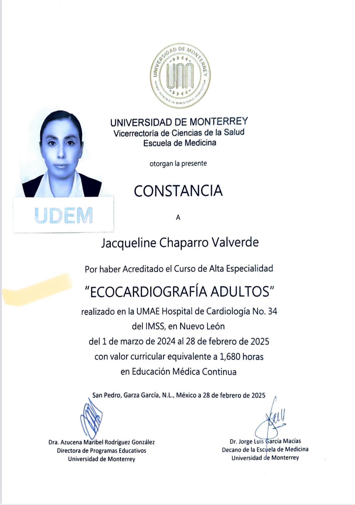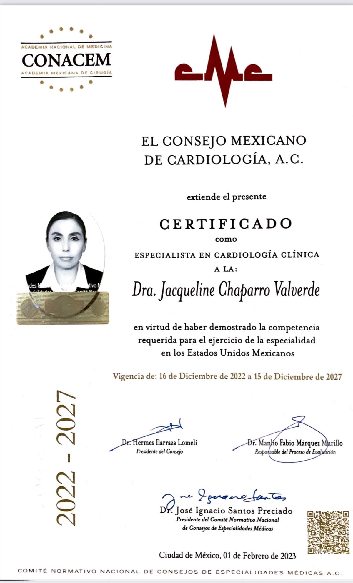 Hola!. Soy Cardióloga-Ecocardiografista certificada por el Consejo Mexicano de Cardiología, estoy a sus órdenes para valoraciones cardiovasculares. Recuerda que la prevención es su mejor aliado, no espere a que el daño sea irreversible, realice su chequeo anual preventivo y de control.