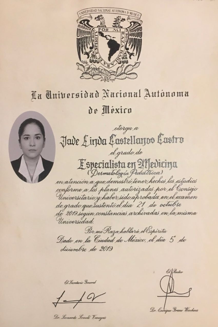 Realicé mi Especialidad en el Hospital Infantil de México Federico Gómez y mi Alta Especialidad en el Hospital General de México "Dr. Eduardo Liceaga", ambas avaladas por la UNAM. Estoy certificada por el Consejo Mexicano de Dermatología. Pertenezco al Colegio Ibero-Latinoamericano de Dermatología y al Colegio Mexicano de Dermatología Pediátrica.
