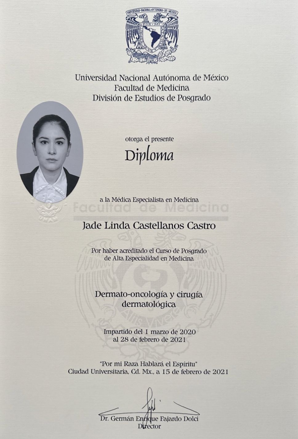 Soy la Dra Jade Castellanos, médico especialista en Dermatología Pediátrica, con Alta Especialidad en Dermato-Oncología y Cirugía Dermatológica, enfocada en el diagnóstico y tratamiento de las enfermedades de piel, pelo y uñas, así como detección oportuna y tratamiento del cáncer de piel.