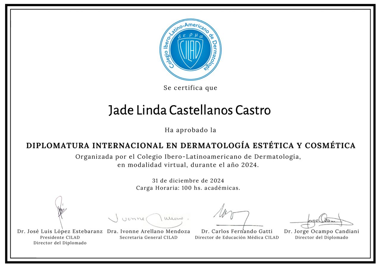 Me encuentro en constante actualización y capacitación. Entre las Diplomaturas que he realizado se encuentran la Diplomatura Internacional en Dermatología Estética y Cosmética y la Diplomatura en Dermatología Oncológica, avaladas por el CILAD.