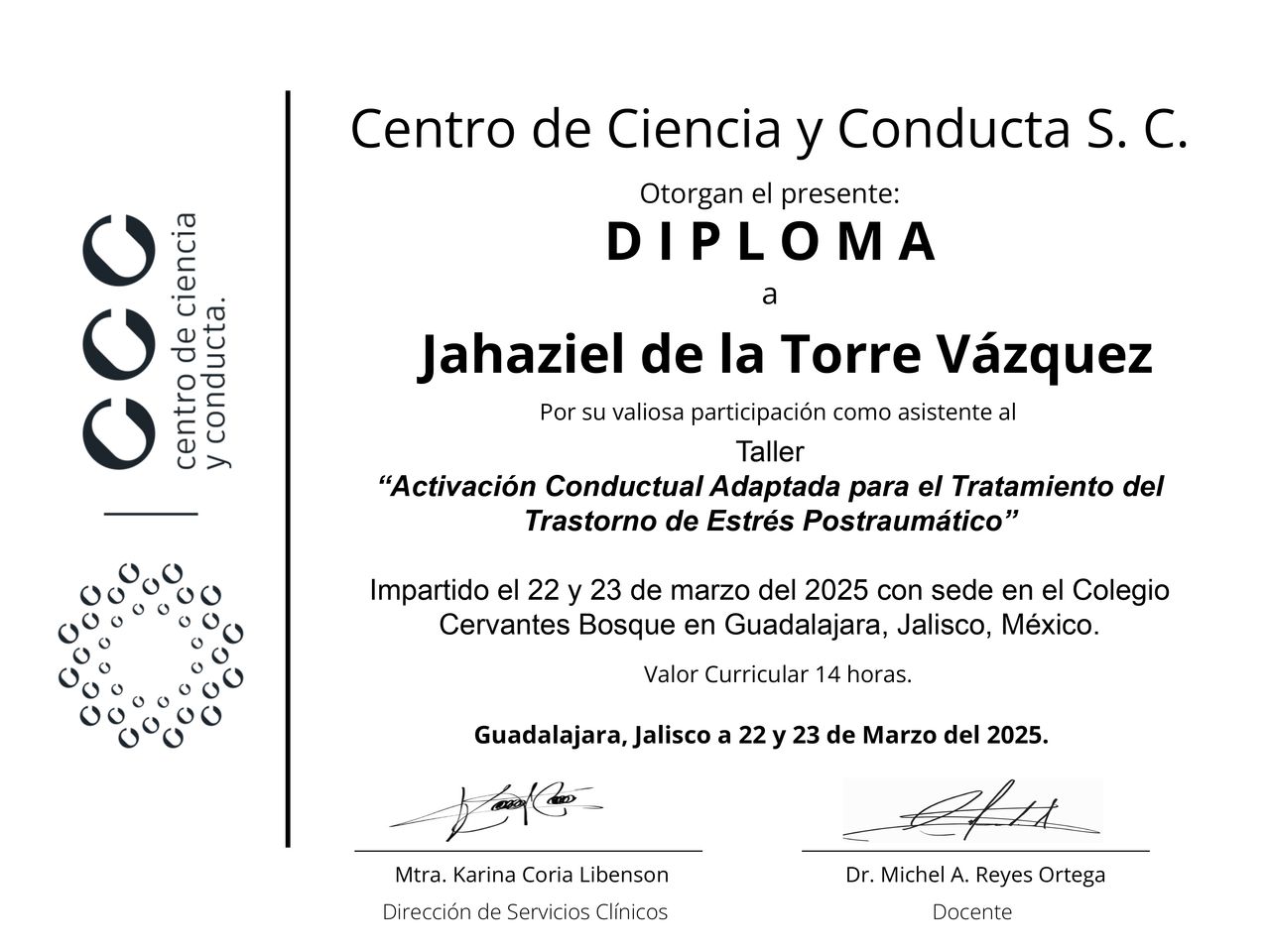 Soy Jahaziel De La Torre, psicólogo especializado en terapias basadas en evidencia científica entre ellas la Terapia de Aceptación y Compromiso (ACT) Terapia Enfocada en la Compasión, Terapia Conductual y Terapia de Exposición Prolongada. Cuento con una maestría en Ciencias del Comportamiento y Neurociencias, mi enfoque se centra en ofrecer un espacio seguro y de confianza donde puedas explorar y mejorar tu relación con tus emociones, pensamientos y comportamientos.