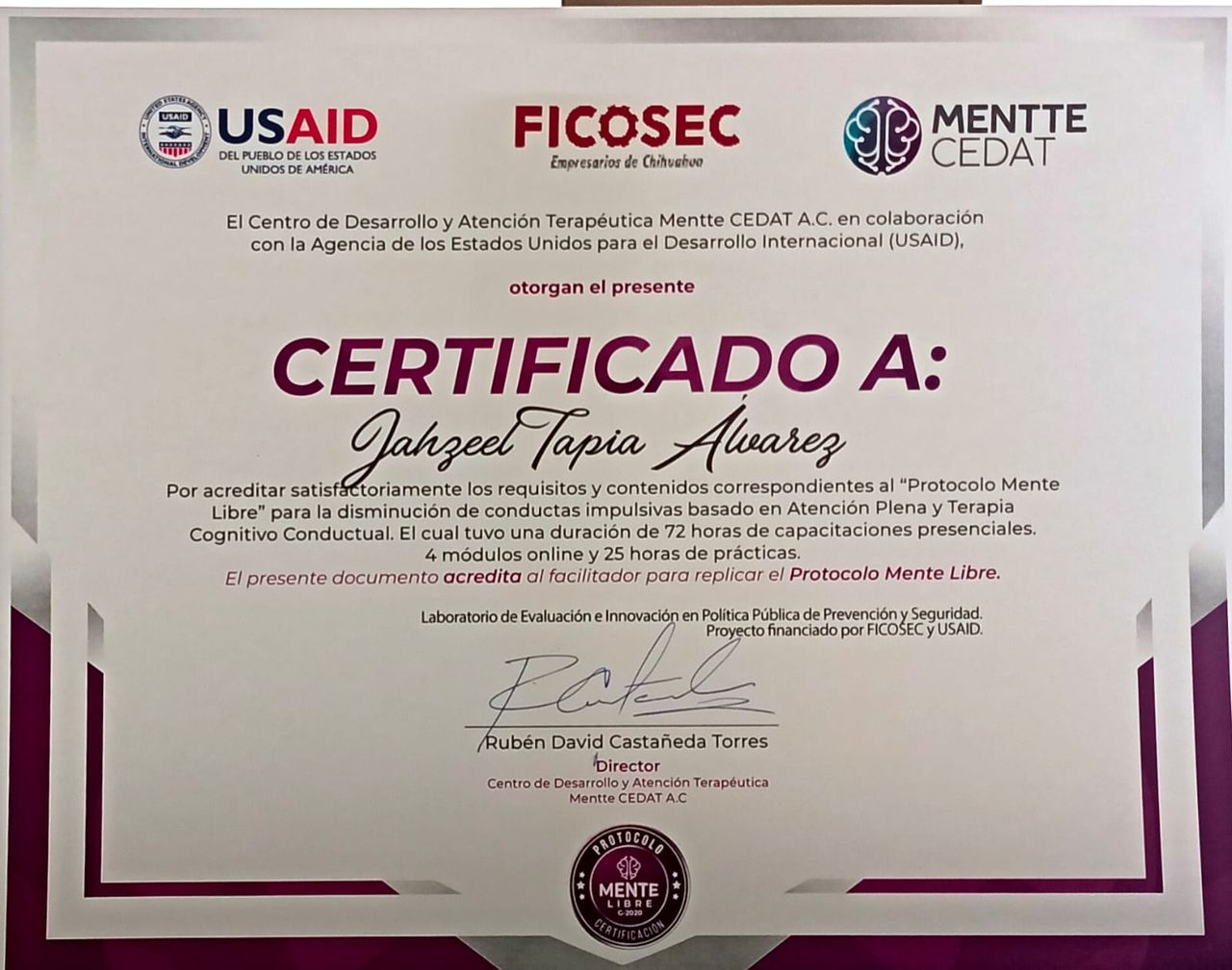 Excelente persona y profesional en su trabajo, mi hijo que ya es un joven con ASPERGER ha sido atendido por ella, propiamente él pide asistir con la psicologa Jahzeel, ya que ella en todo momento le ha brindado esa atención y enpatia requerifas para estos casos, como mamá y paciente estoy muy agradecida y la recomiendo ampliamente. 100%.