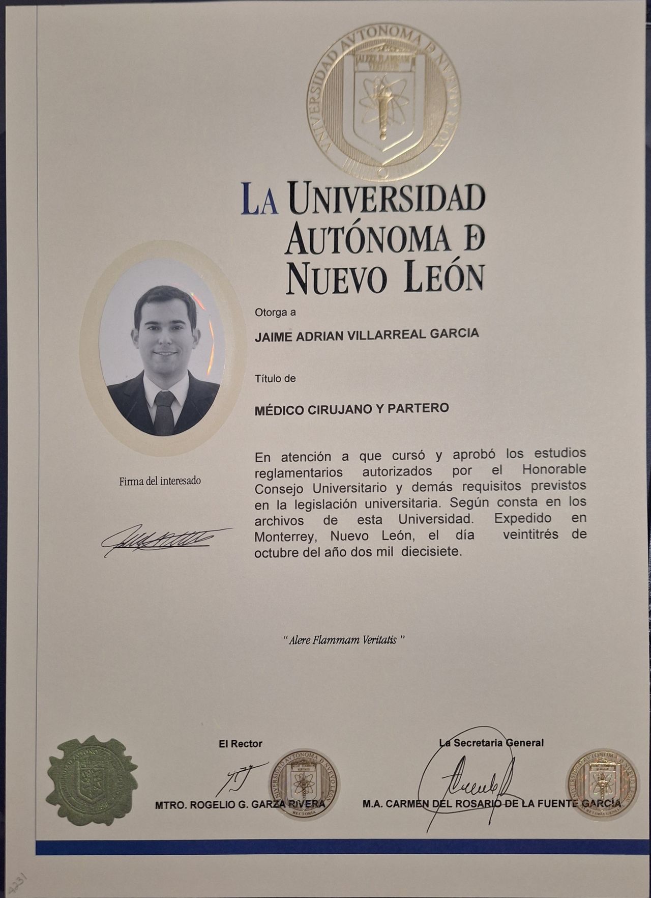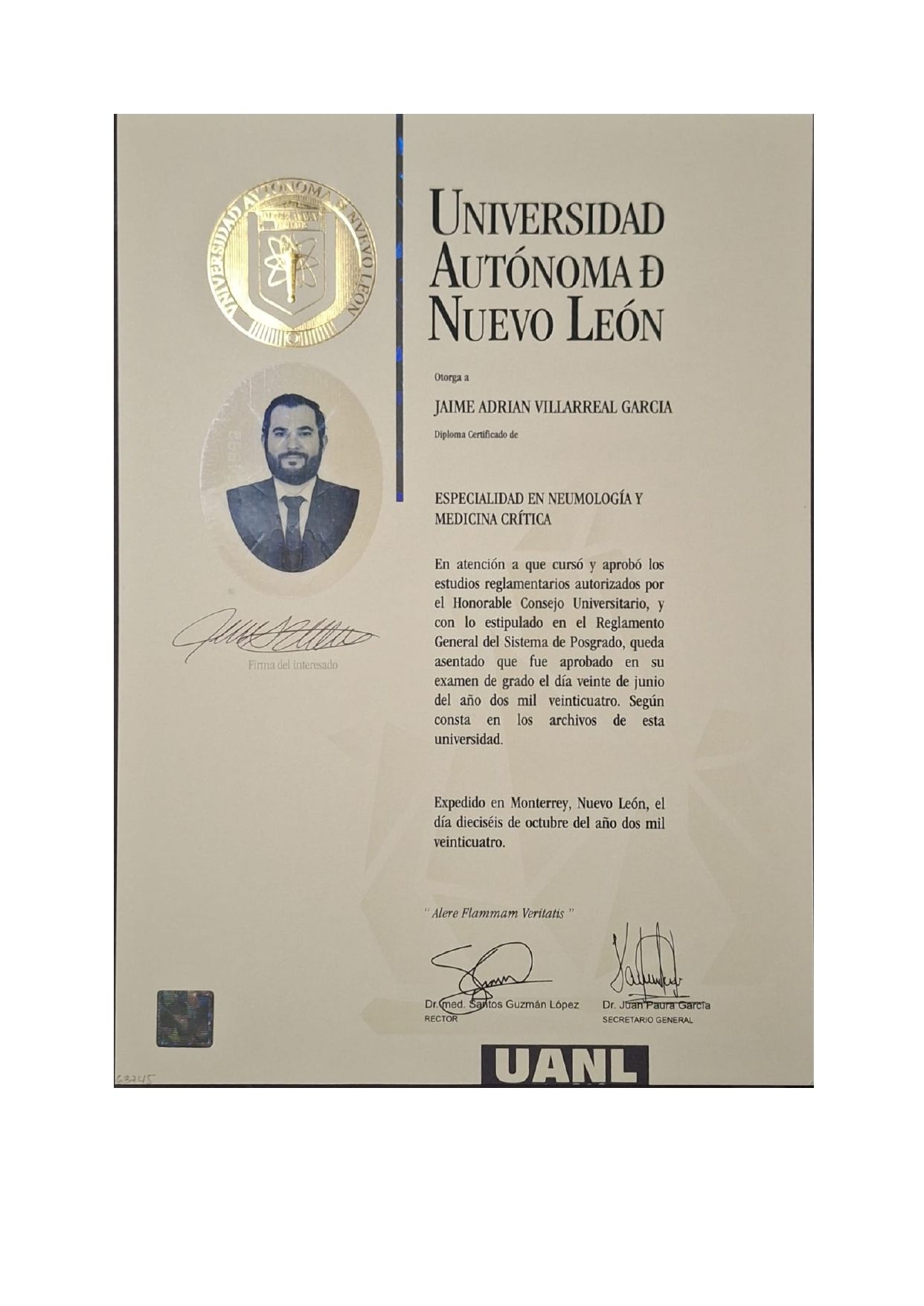 Soy el Dr. Jaime Adrián Villarreal García, neumólogo con especialidad en Medicina Crítica y Terapia Intensiva, formado en la UANL y el Hospital Universitario “José Eleuterio González”. Me dedico al diagnóstico, tratamiento y seguimiento de enfermedades respiratorias agudas y crónicas que comprometen la función pulmonar, así como a la atención de pacientes que requieren cuidados intensivos. Mi enfoque profesional combina el uso de tecnología avanzada con protocolos clínicos actualizados, siempre buscando no solo tratar la enfermedad, sino también prevenir complicaciones y mejorar la calidad de vida de quienes confían en mí.