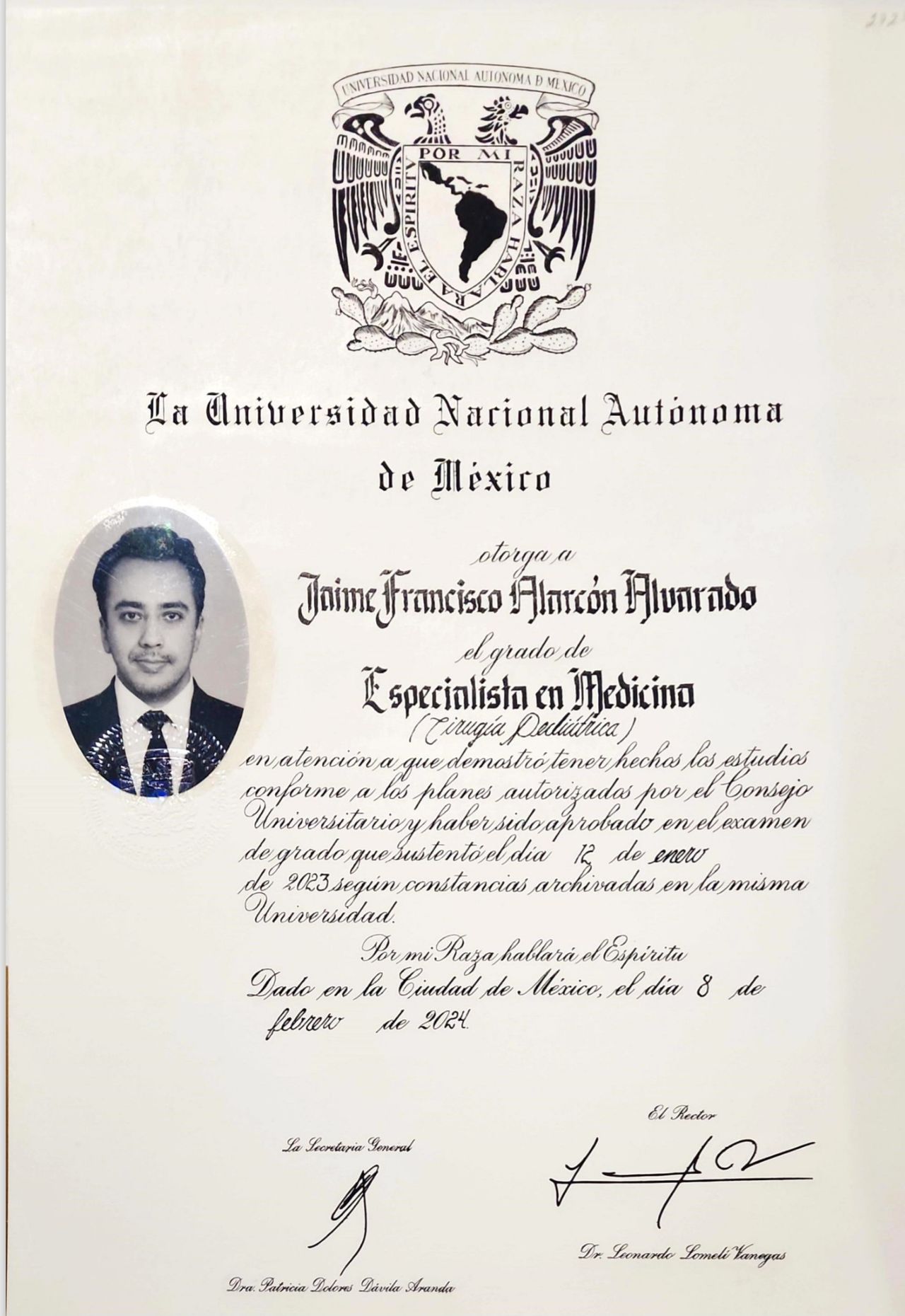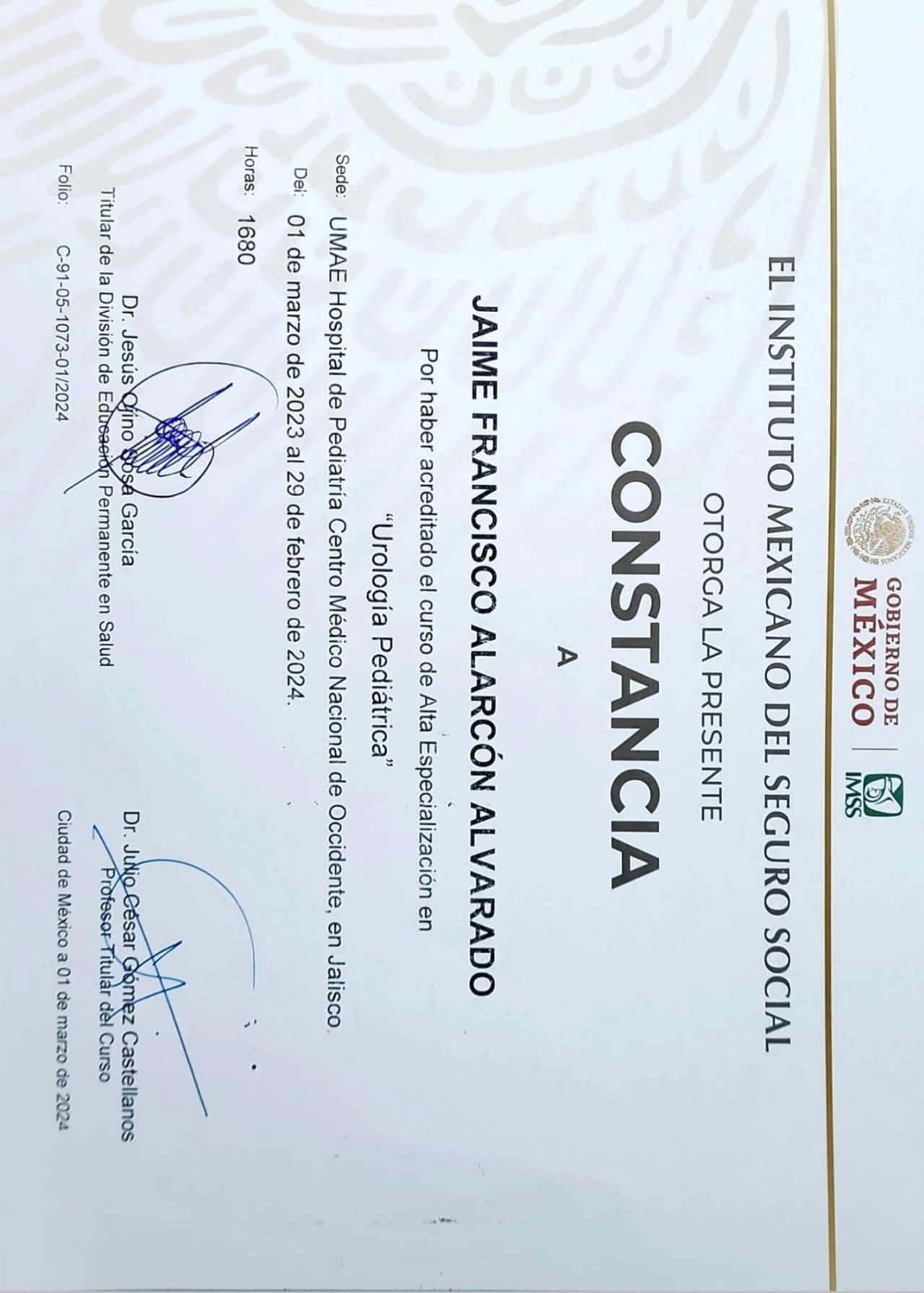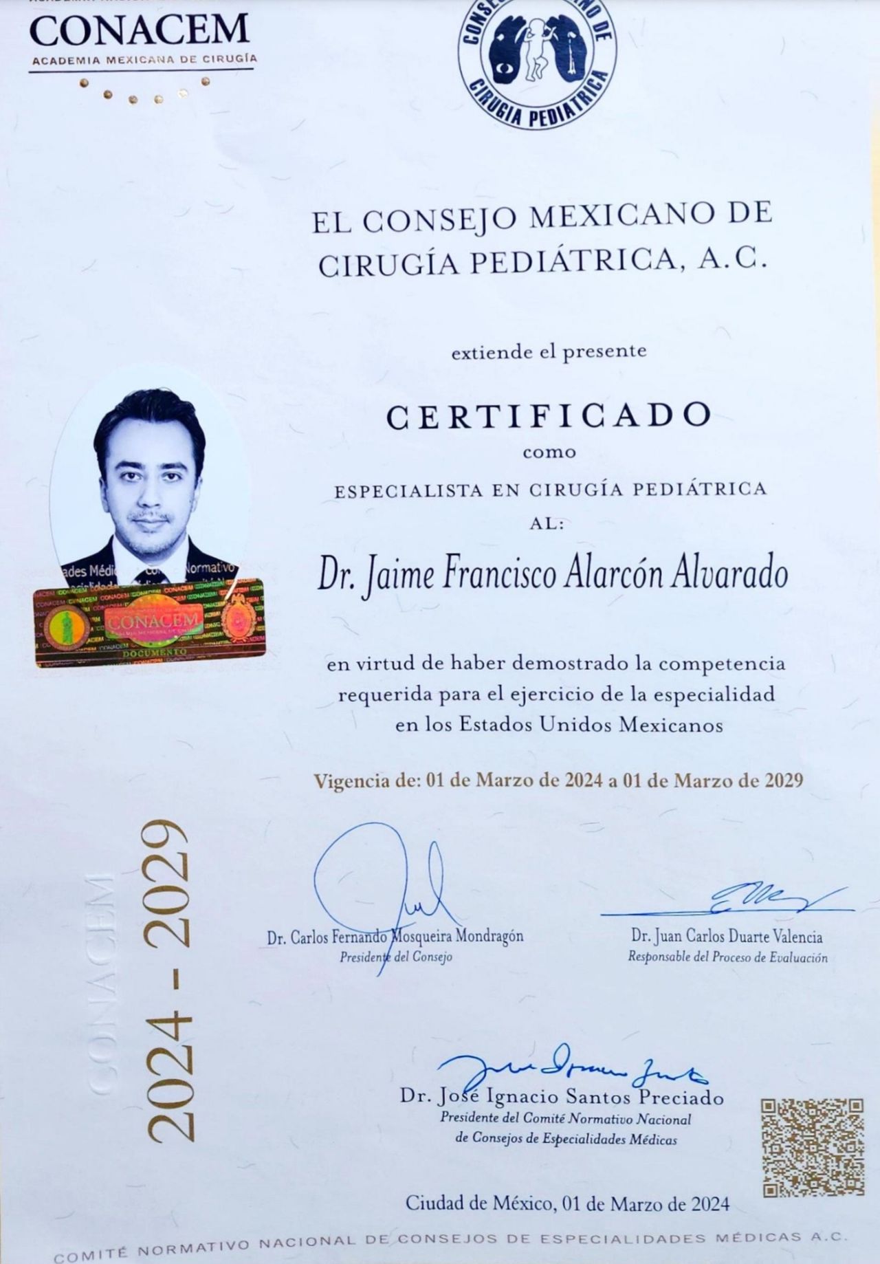 Hola!! Buen Dia. Soy el Dr. Jaime Francisco Alarcón Alvarado especialista en Cirugía Pediátrica / Urología Pediátrica. Egresado de la Universidad Juárez del Estado de Durango de la Licenciatura de Medico Cirujano, egresado de la UNAM con la especialidad en Cirugía Pediátrica. Realice la alta especialidad en Urología Pediátrica en el Centro Medico Nacional de Occidente siendo este centro de referencia a nivel nacional. Cuento con la experiencia, conocimiento, compromiso y capacidad para otorgar una atención de calidad y poder brindarte soluciones reales y efectivas a los problemas que aquejen a tu hijo y/o hija, todo esto de manera integral.