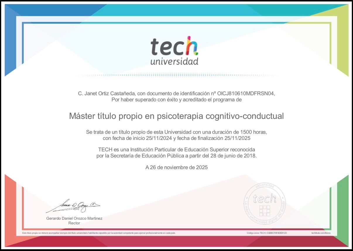 Tengo una maestría en Psicología, un Máster en psicoterapia cognitivo conductual, Diplomado en psicología educativa. Diplomado en tratamientos en psicología clínica infantojuvenil; cursé Diplomado en Psicoterapia de juego, realicé cursos de Valoración del desarrollo y Psicopedagogía, Curso de Terapias de reforzamiento de habilidades de atención y funciones ejecutivas y Diplomado en Estimulación temprana y diversos cursos sobre TDAH en las diferentes edades de desarrollo; cursos en primeros auxilios psicológicos, duelo, depresión; entre otros cursos de actualización continua. Mi carrera me apasiona ya que puedo aplicarla en mi vida personal y profesional, al tiempo que con ella puedo ayudar a otros a encontrarse consigo mismos, cambiar pensamientos negativos y modificar conductas negativas, mejorar sus habilidades, manejar emociones y lograr la mejor versión de sí mismo, alcanzando su potencial.
