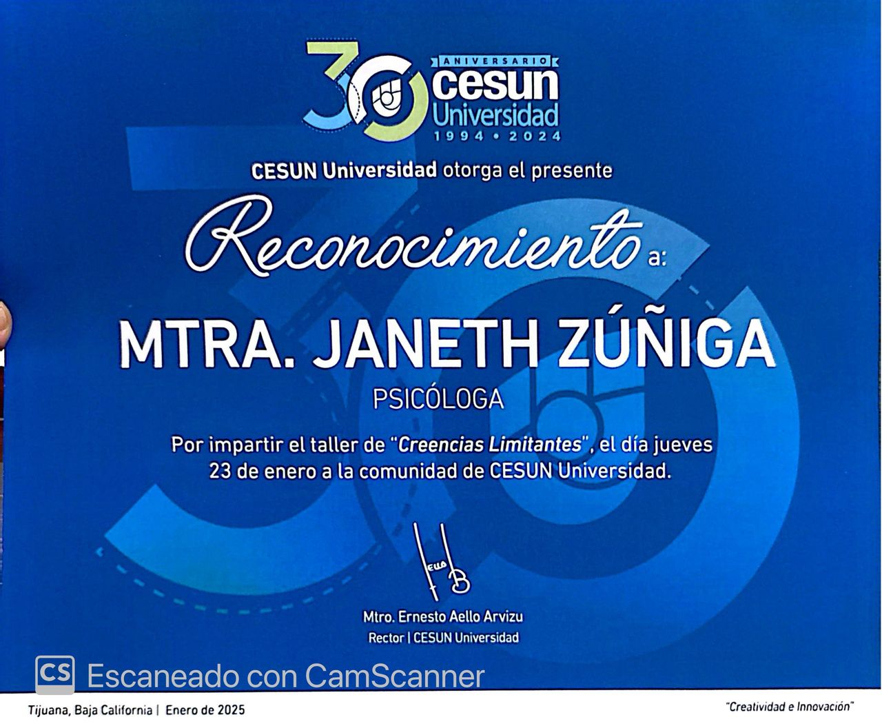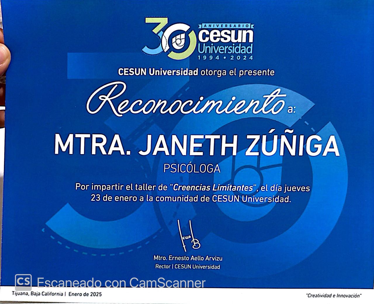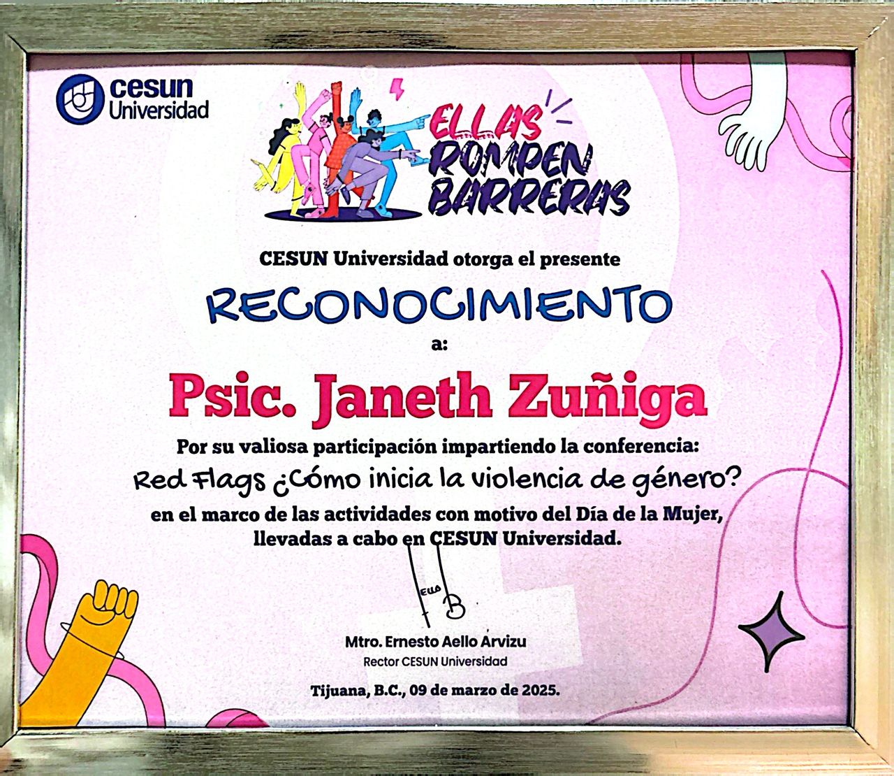 Hola! Soy Janeth Zúñiga, psicoterapeuta individual, familiar y de pareja, con mas de 10 años de experiencia en la terapia privada, en terapia de grupo, terapia familiar y de pareja, cuento con maestría en psicoterapia familiar y de pareja, diplomados en Tanatológia y TCC, certificada como conferencista internacional, participando desde hace mas de 12 años impartiendo talleres, platicas y conferencias en temas de psicología, tales como estrés, depresión, trastornos de personalidad, trastornos alimenticios, crisis familiares, adicciones, entre otros, así mismo, he participado en el sector empresarial privado y publico en intervenciones con lideres para proporcionarles herramientas que los ayuden en su interacción con su personal a cargo, el adecuado manejo de estrés laboral, ansiedad laboral y programas de prevención de burnout. Originaria de Tijuana B.C.