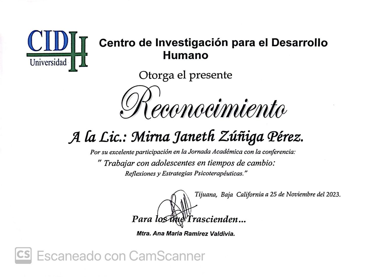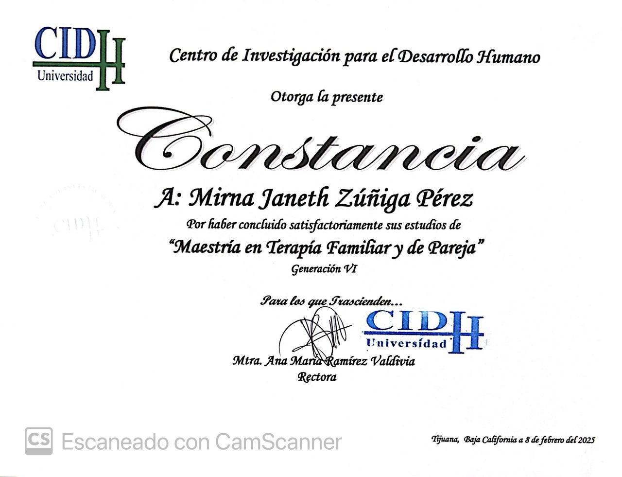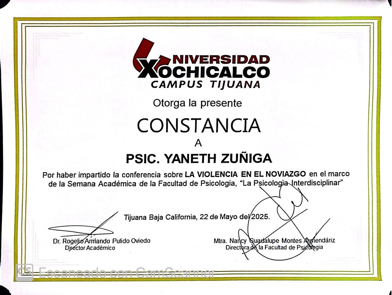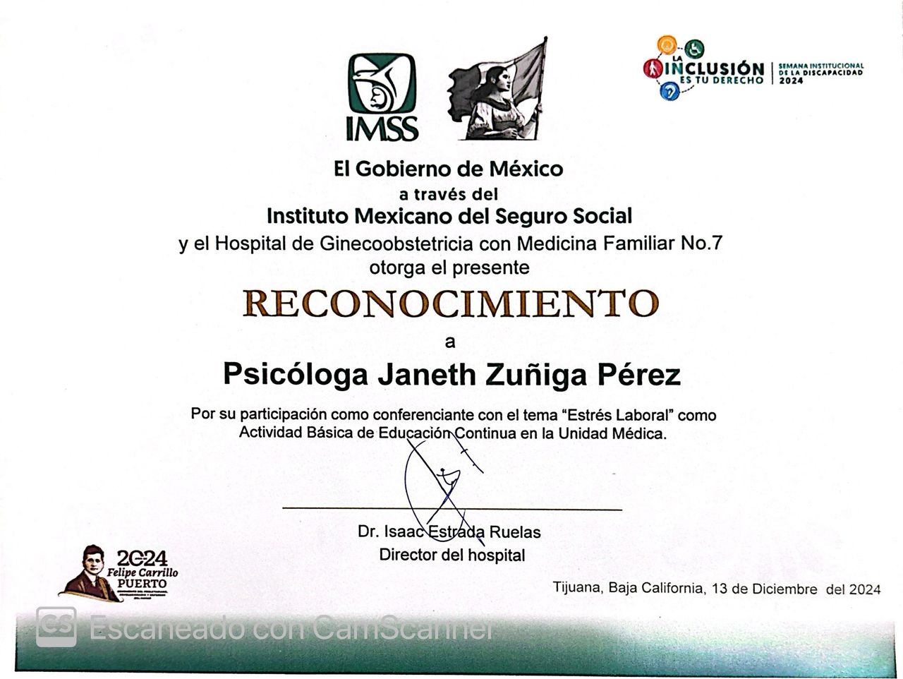 Hola! Soy Janeth Zúñiga, psicoterapeuta individual, familiar y de pareja, con mas de 10 años de experiencia en la terapia privada, en terapia de grupo, terapia familiar y de pareja, cuento con maestría en psicoterapia familiar y de pareja, diplomados en Tanatológia y TCC, certificada como conferencista internacional, participando desde hace mas de 12 años impartiendo talleres, platicas y conferencias en temas de psicología, tales como estrés, depresión, trastornos de personalidad, trastornos alimenticios, crisis familiares, adicciones, entre otros, así mismo, he participado en el sector empresarial privado y publico en intervenciones con lideres para proporcionarles herramientas que los ayuden en su interacción con su personal a cargo, el adecuado manejo de estrés laboral, ansiedad laboral y programas de prevención de burnout. Originaria de Tijuana B.C.
