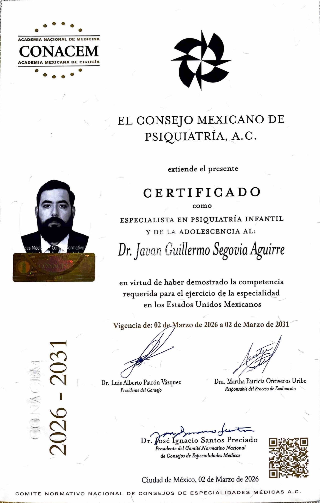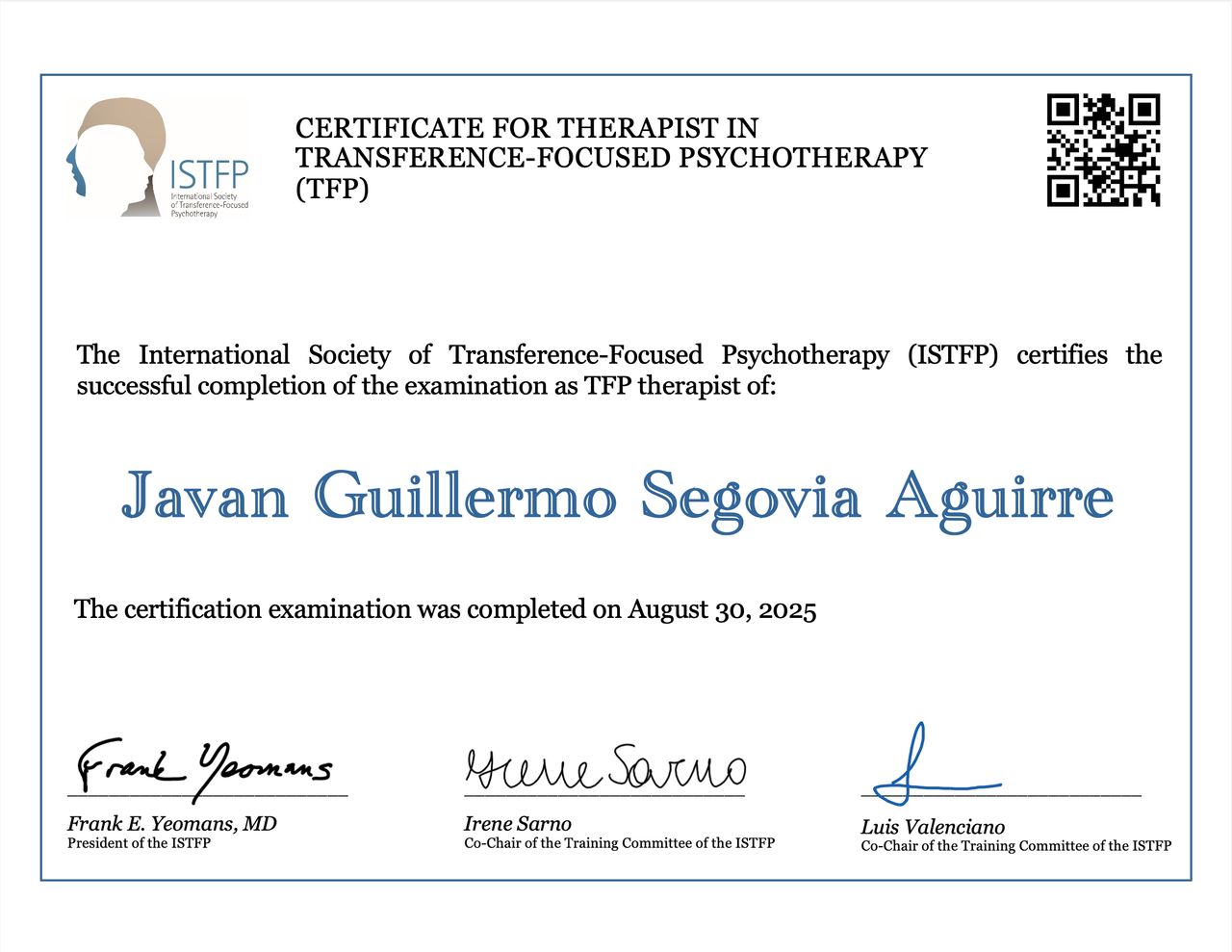 Soy Médico cirujano y partero, egresado de la especialidad en psiquiatría y psiquiatría del niño y el adolescente por UNAM y el Instituto Nacional de Psiquiatría Ramón de la Fuente. Psicoterapeuta certificado en psicoterapia focalizada en la transferencia por la ISTFP. Maestría en psicoterapia psicoanalítica por UIC (en curso).