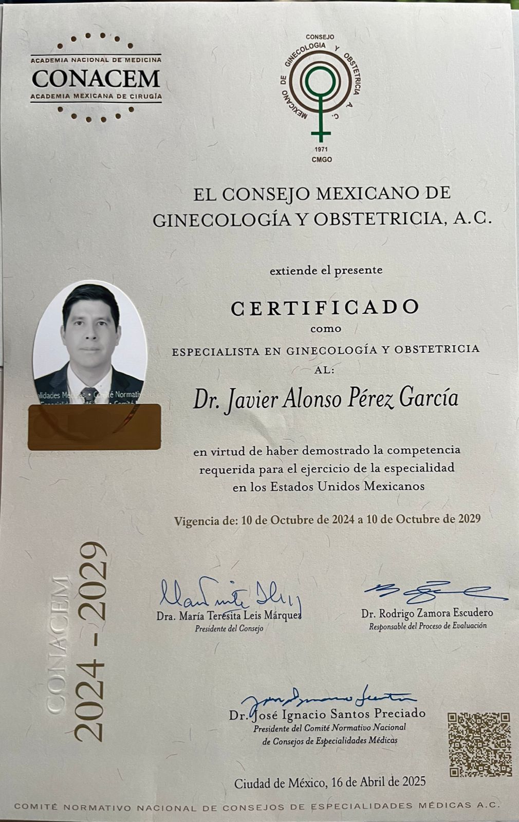 Certificado por el Consejo Mexicano de Ginecología y Obstetricia.