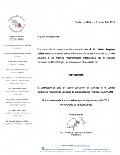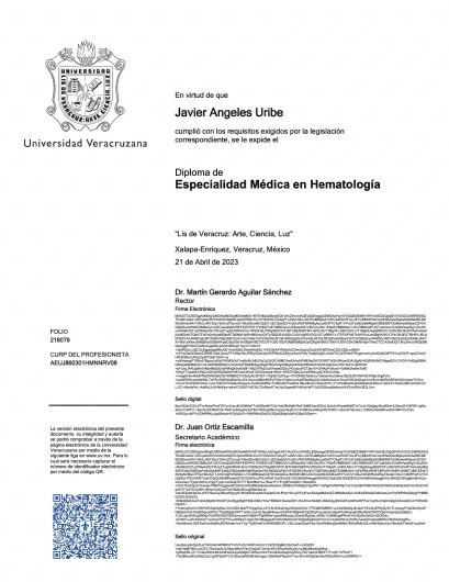 Soy el doctor Javier Angeles, especialista en enfermedades de la sangre, con Alta Especialidad en Mieloma Múltiple, certificado por el Consejo Nacional de Hematología para brindar una práctica médica de la mas alta calidad y confianza en el bajío. Tengo la experiencia para ayudarte a resolver tu problema de salud. Brindo mi apoyo y cercanía posterior para un buen seguimiento, resolviendo todas tus dudas que te puedan surgir después de la consulta. Para una consulta urgente, puedes contactarte conmigo.