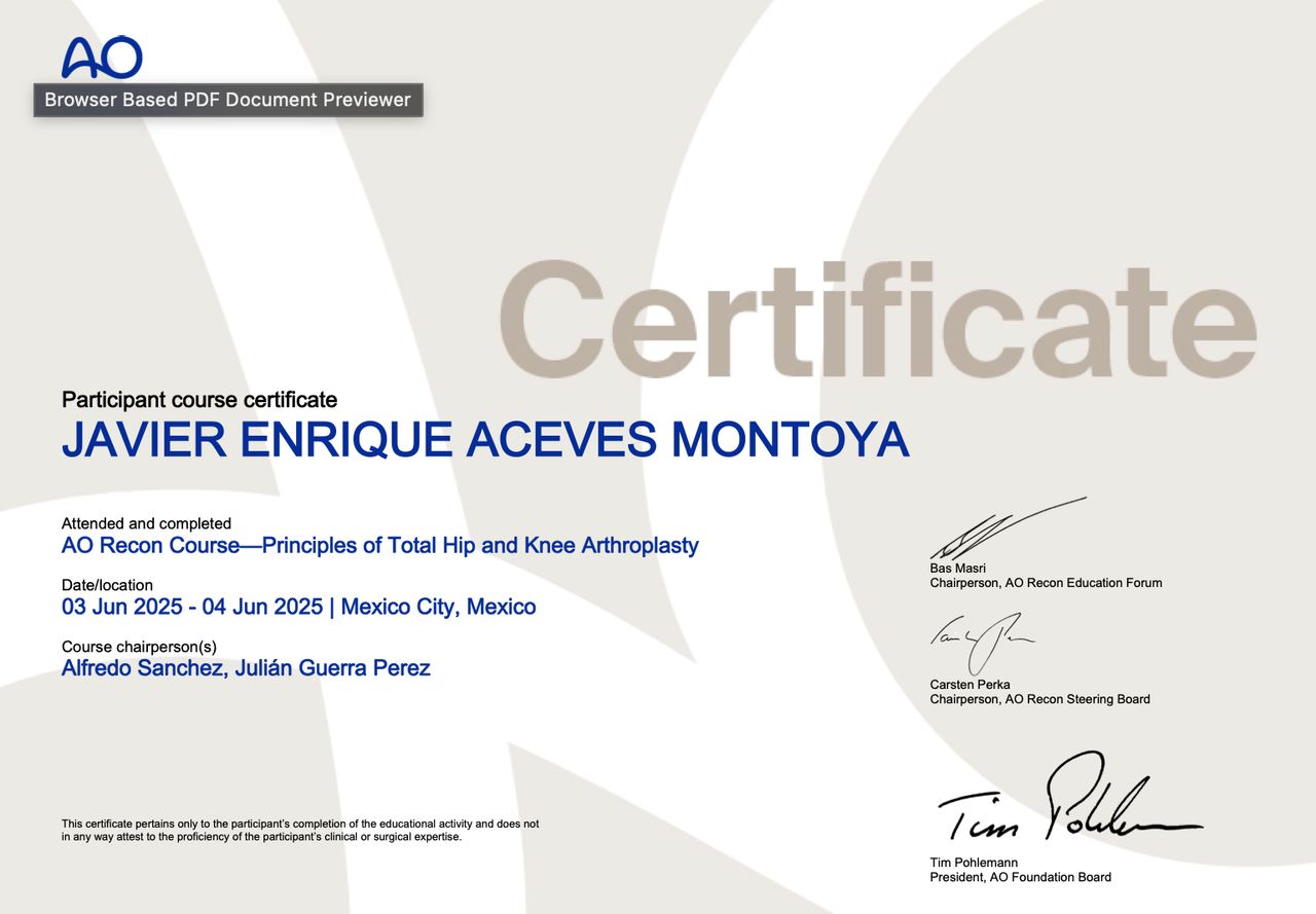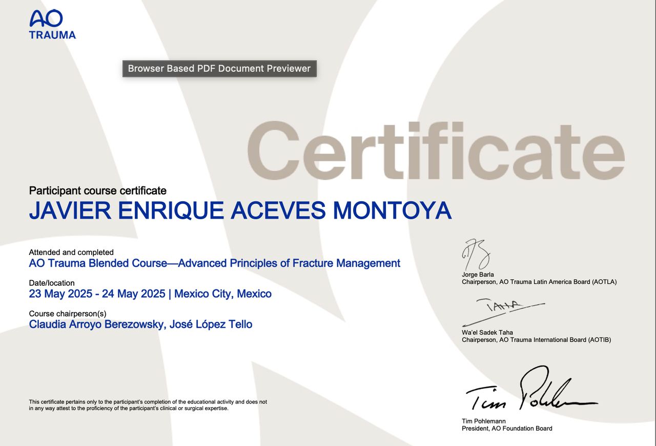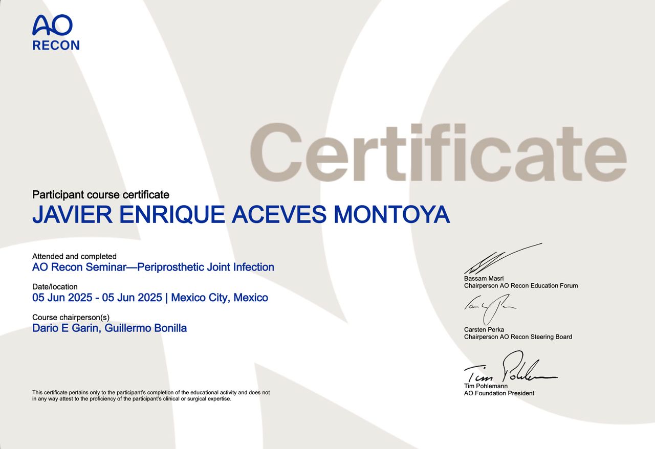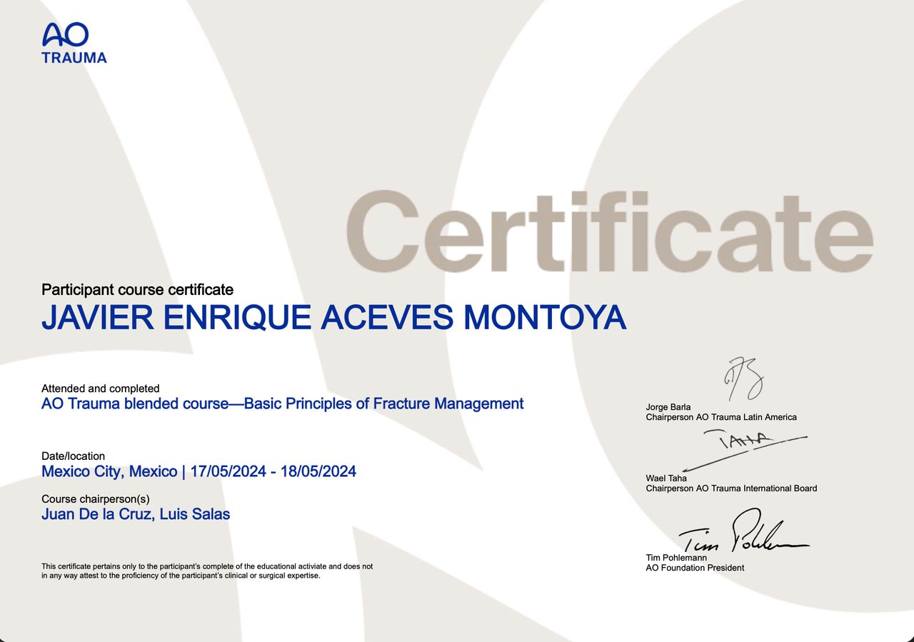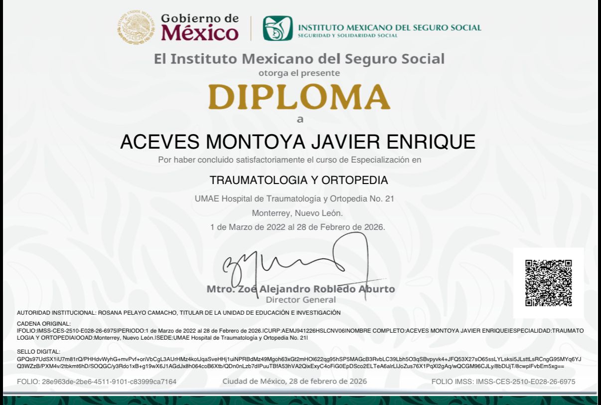 Actualmente en formación avanzada en cirugía de hombro, rodilla y codo, con experiencia en manejo tanto quirúrgico como conservador de lesiones musculoesqueléticas.