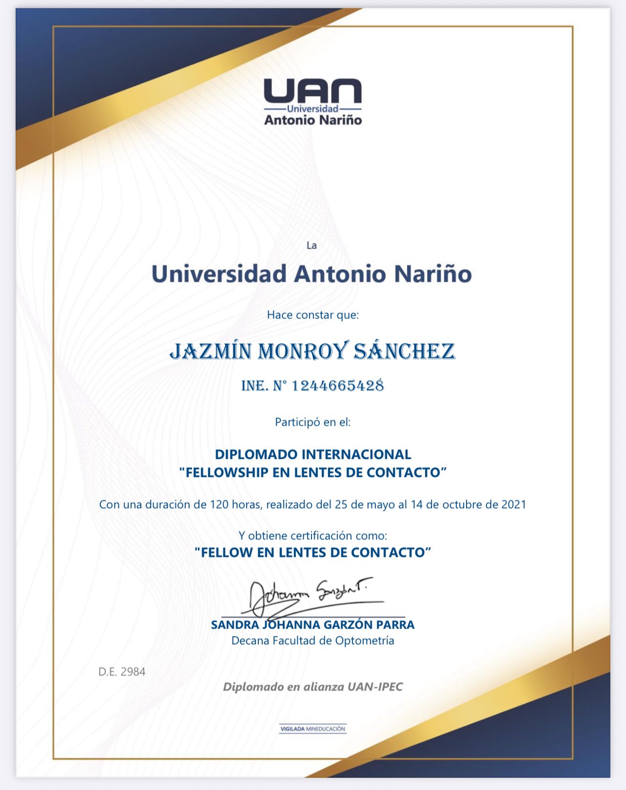 Licenciada en Optometría, egresada de la Universidad Autónoma de Querétaro. Soy Jazmín, me gusta cuidar de la salud visual de mis pacientes siempre de manera personalizada, profesional y empatica en su consulta visual, así como también trabajar siempre de manera multidisciplinaria con otros especialistas si es necesario para el bienestar de mis pacientes.